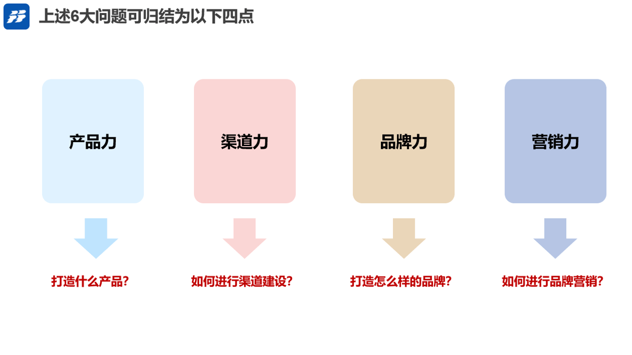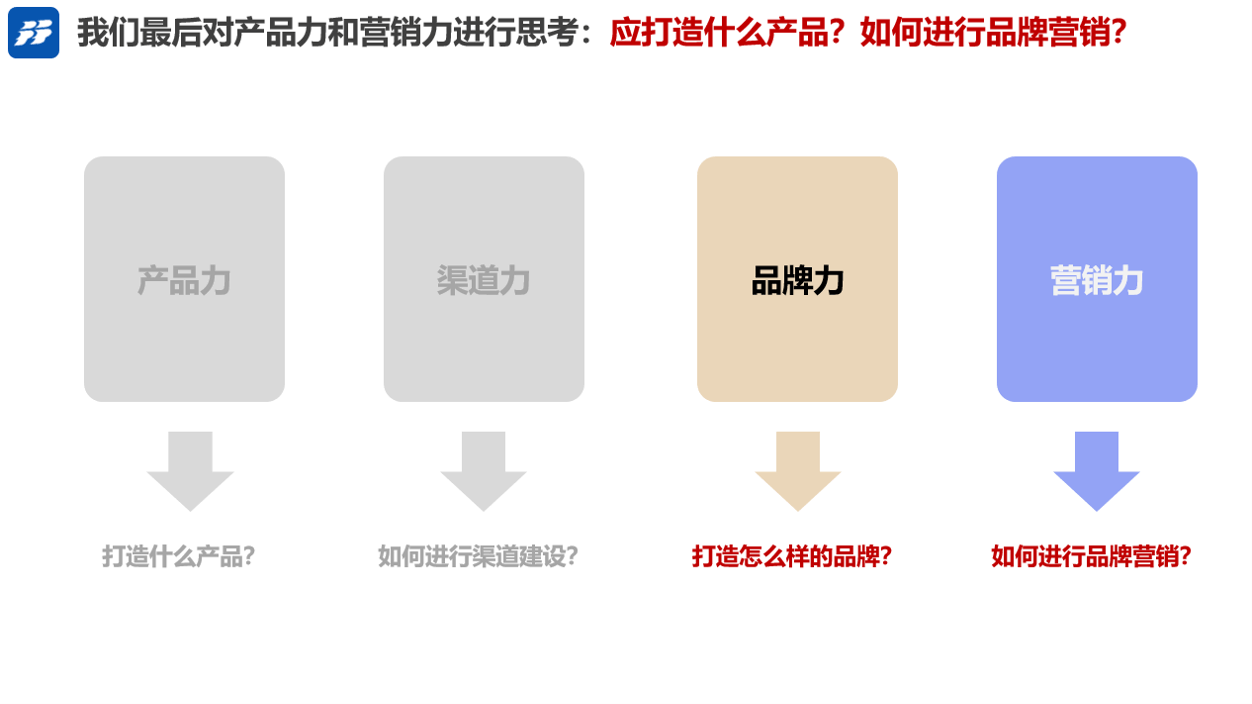 我们将以上的问题进行归纳后,其实无非就是产品力、渠道力、品牌力、营销力的问题。因此,我们围绕着这4力,对以上的问题进行进一步的思考。我们首先对产品力进行思考:应打造什么产品?在对比了酵素碳酸饮料和即饮咖啡两大市场后,我们发现整体咖啡市场增速较快,前景向好,但是竞争较为激烈,头部企业体量大,若德信此时入局,面临的调整将更为严峻;对比即饮咖啡市场,健康饮品市场暂未形成强竞争,细分赛道尚未出现头部品牌,因此我们建议,先期主要发力酵素碳酸饮料更为合适。