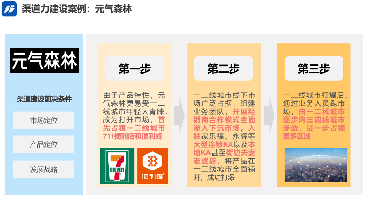 在渠道方面,城市如何开拓,渠道如何开拓?需要根据产品与品牌定位出发。我们以元气森林为例来看,其清晰的市场定位、产品定位、品牌战略是渠道建设的前决条件。紧接着,第一步,由于产品特性,元气森林更易受一二线城市年轻人青睐,故为打开市场,首先占领一二线城市711便利店和便利蜂;第二步,一二线城市线下市场广泛占据,组建业务团队,开展经销商合作模式全面渗入下沉市场,入驻家乐福、永辉等大型连锁KA以及本地KA甚至街边夫妻老婆店,将产品在一二线城市全面铺开,成功打爆;第三步,一二线城市打爆后,通过业务人员跑市场,由一二线城市逐步向三四线城市渗透,进一步占领更多区域。因此,渠道力需要策略支撑,策略如何制定,才是关键!