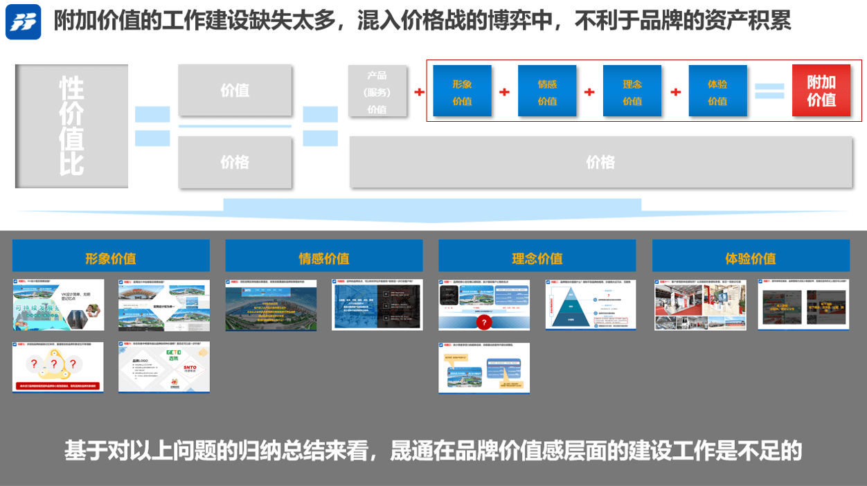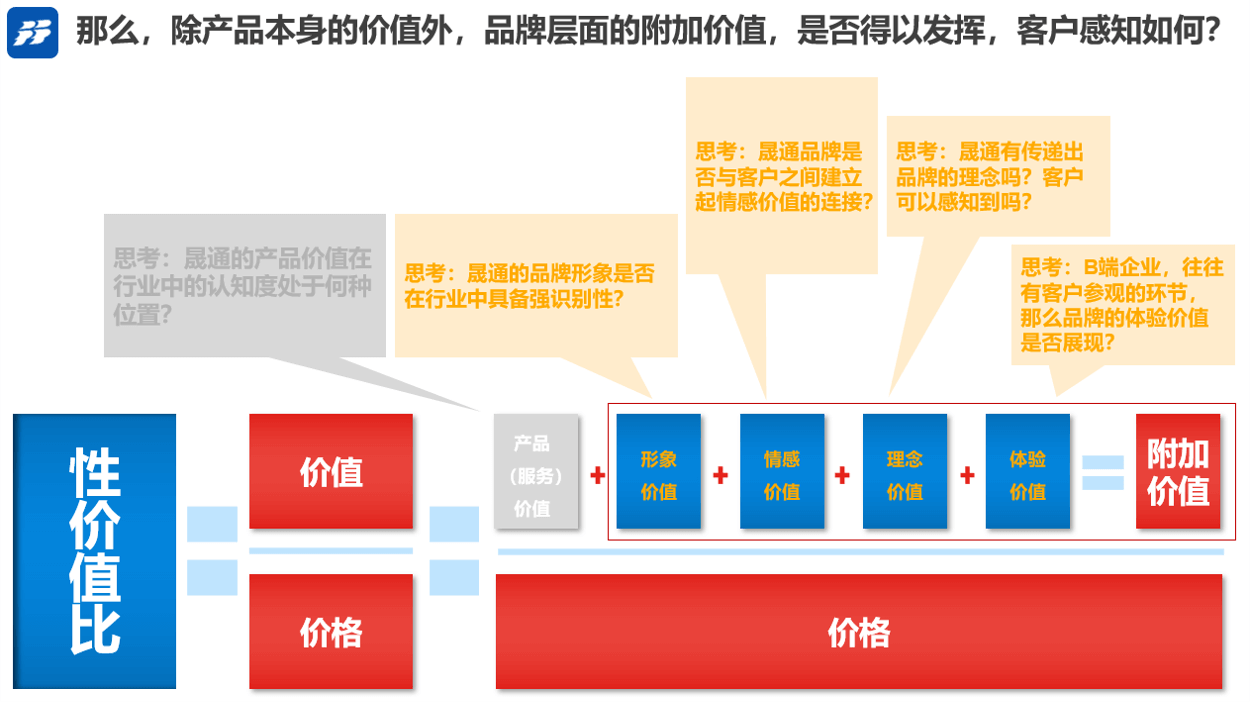 对于晟通来说,产品价值存疑比较小,前面其高层领导提到过,晟通的产品在行业中认可度较高,处于第一梯队中。问题就在于品牌的附加价值如何体现,其建设完善化程度又有多少?如形象层面,晟通的品牌形象是否在行业中具备强识别性?晟通品牌是否与客户之间建立起情感价值的连接?晟通有传递出客户可感知的品牌格局吗?在客户参观体验的环节中,品牌的体验价值是否充分展现?