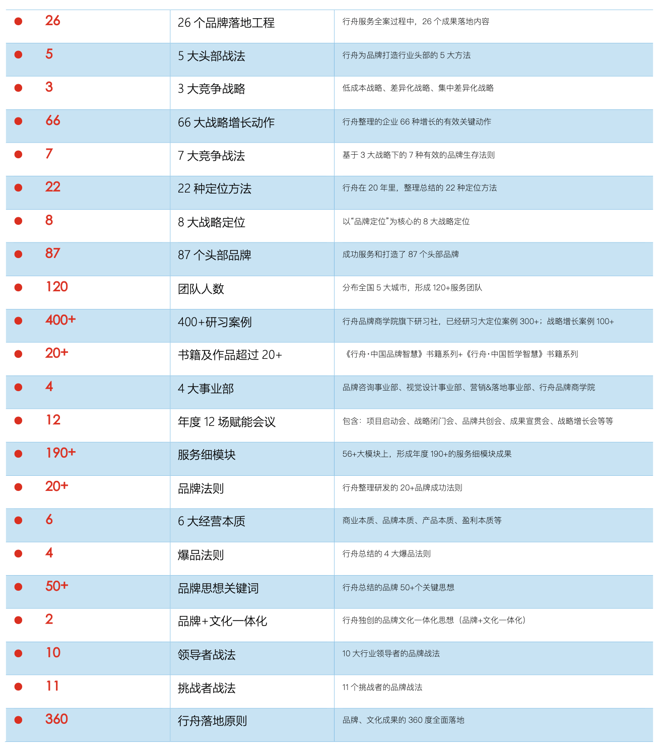 56+全案服务成果:行舟的年度服务成果,在同类咨询公司中是蕞为系统的,包括了16大战略,15大策略,25+品牌营销落地。