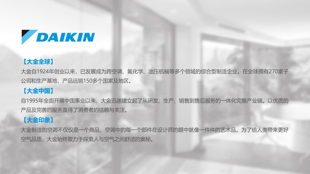 大金自1924年创业以来,已发展成为跨空调、氟化学、油压机械等多个领域的综合型制造企业。在全球拥有270家子公司和生产基地,产品远销150多个国家及地区。自1995年全面开展中国事业以来,大金迅速建立起了从研发、生产、销售到售后服务的一体化完整产业链。以优质的产品及完善的服务赢得了消费者的信赖与关注。大金制造的空调不仅仅是一个商品,空调中的每一个部件在设计师的眼中就像一件件的艺术品。为了给人类带来更好空气品质,大金始终致力于探索人与空气之间舒适的奥秘。