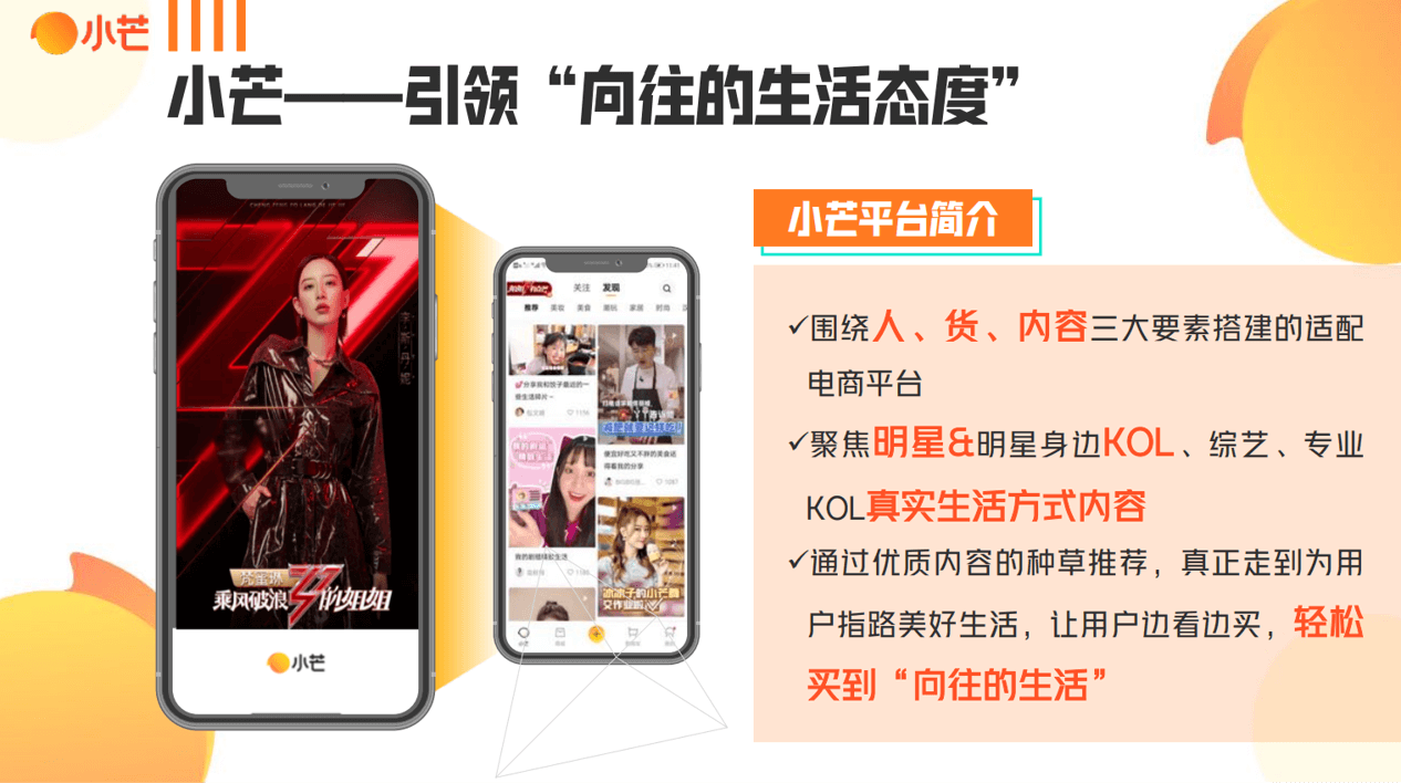 湖南快乐阳光互动娱乐传媒有限公司的小芒APP是集合社交、内容、电商于一体的社交电商平台。芒果TV向小芒输送优质视频内容及丰富的娱乐资源,形成小芒直播+优质精选内容+丰富优质商品的娱乐电商生态体系,定位为业内最具青春号召力,最具购买场景,最富综艺特性的电商平台,走一条边娱乐边社交边购买的电商平台之路。