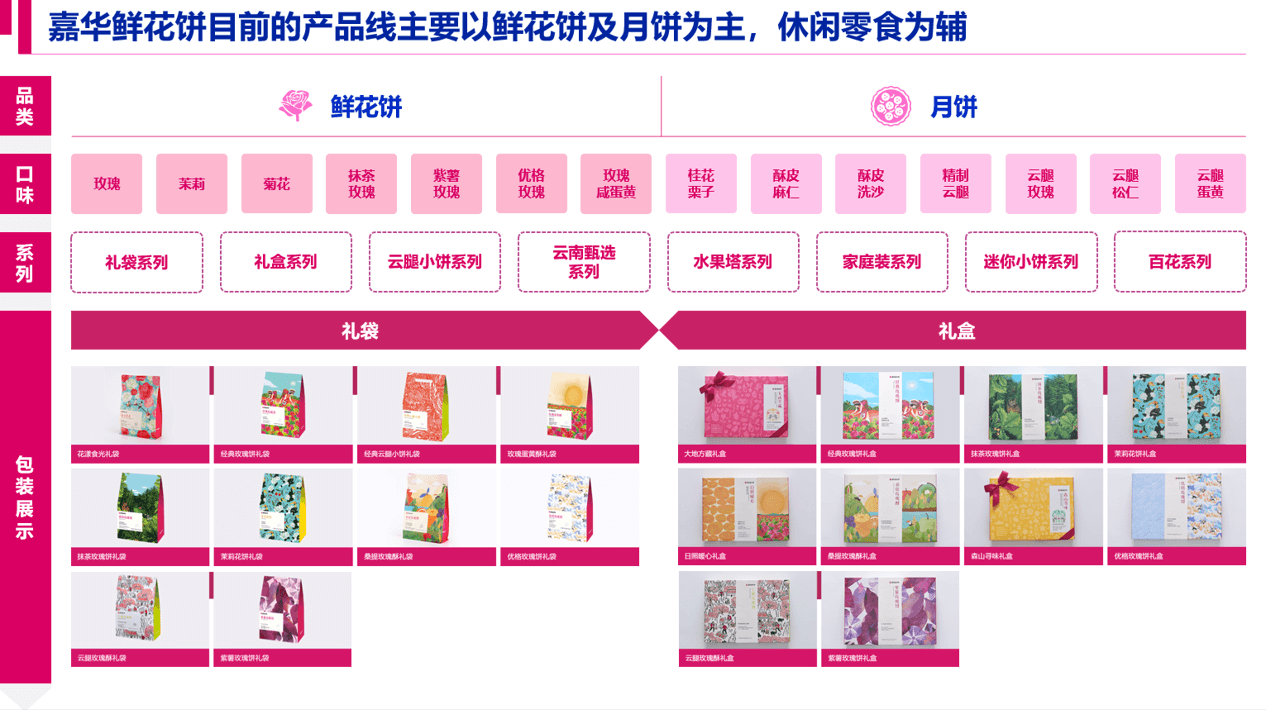 8、产品包装:嘉华鲜花饼各类型的产品包装视觉表达多以口味进行区分,同系列产品可以从盒型、袋型、以及产品名、位置等元素中感受到系列感,但是整体来说,缺乏更具识别度的超级性元素,使消费者第一眼看到包装就直接联想到嘉华感知的比较弱;