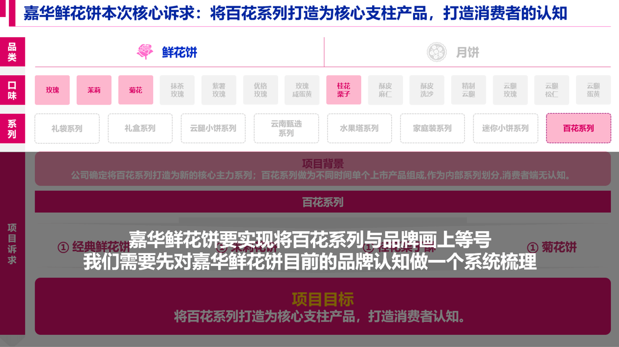 本次嘉华鲜花饼的核心诉求是将旗下百花系列打造为核心支柱产品,重新打造消费者的认知。面对嘉华的需求,我们首先梳理了嘉华鲜花饼的产品线,目前主要以鲜花饼及月饼为主,休闲零食为辅,其中销量位居榜首的经典玫瑰花饼,若要将百花系列,即经典玫瑰花饼、茉莉花饼、桂花栗子酥、菊花饼,直接与品牌画上等号,需要先对嘉华鲜花饼目前的品牌认知现状做一个系统梳理。