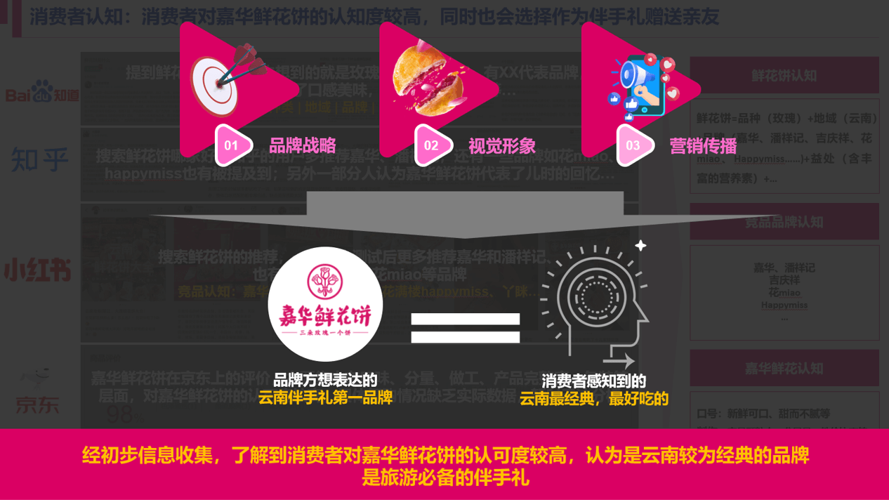 我们利用行舟的大定位理论,从品牌战略、视觉形象、营销传播三大维度进行分析,旨在了解嘉华鲜花饼的品牌信息传递到消费者脑中时,消费者感知到的是什么?消费者的最终感知和品牌倡导的核心是否一致。我们通过嘉华鲜花饼品牌的信息网站、资料咨讯、线上测评获取的信息,对品牌进行了系统的梳理,品牌战略现状: