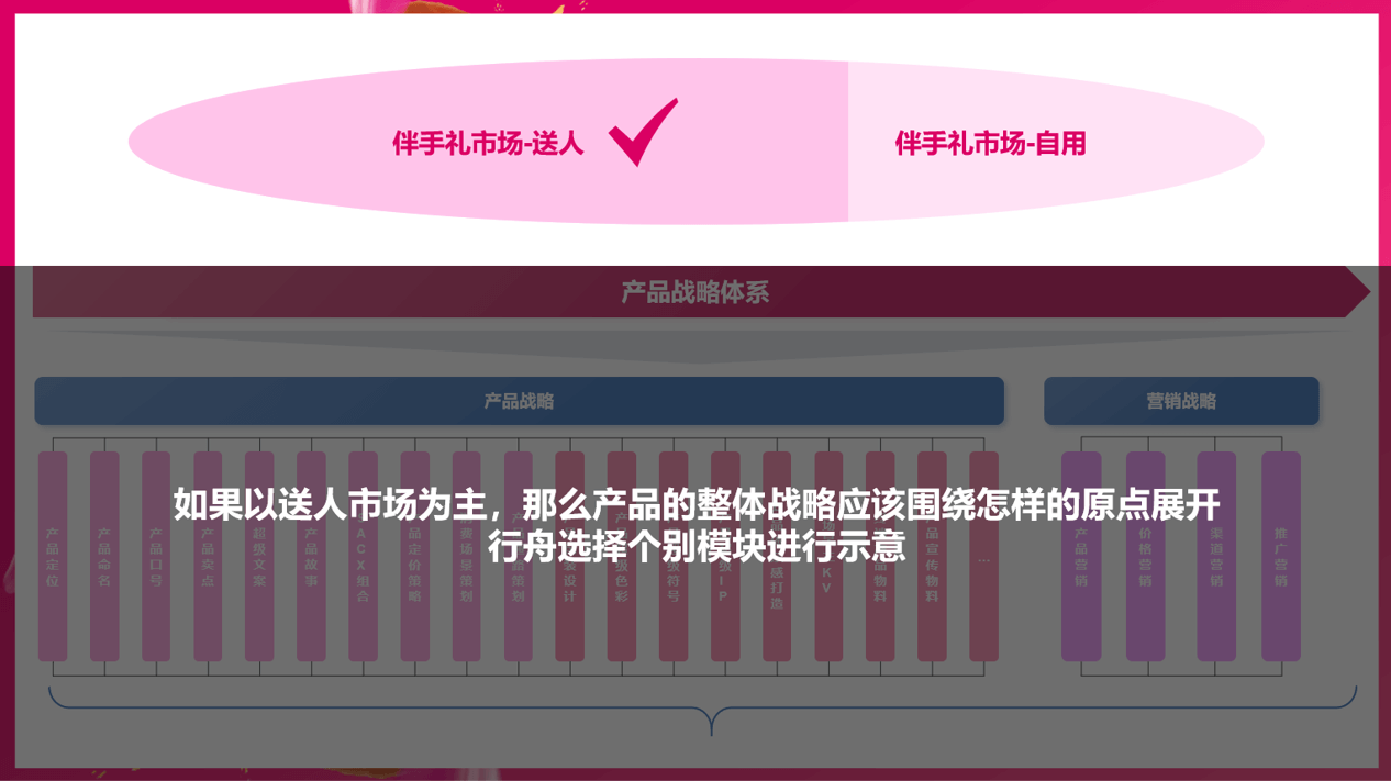 产品战略体系中最为核心的是产品定位,产品定位需要明确所处市场,嘉华鲜花饼所处伴手礼赛道,那么送礼市场又分为送人与自用,我们以送人市场为例来进行思考,首先送礼市场的几大特征:传达情谊、有情感价值、体现个性化,是珍贵情谊的象征。嘉华鲜花饼作为云南的一张名片,希望来到游人都能将嘉华最好的百花产品作为“最好的礼遇”馈赠与身边的亲友,因此产品定位可以以“最好的礼遇“为导向,进行发力,口号也需要围绕定位展开,如”嘉华百花,可带走的礼遇“