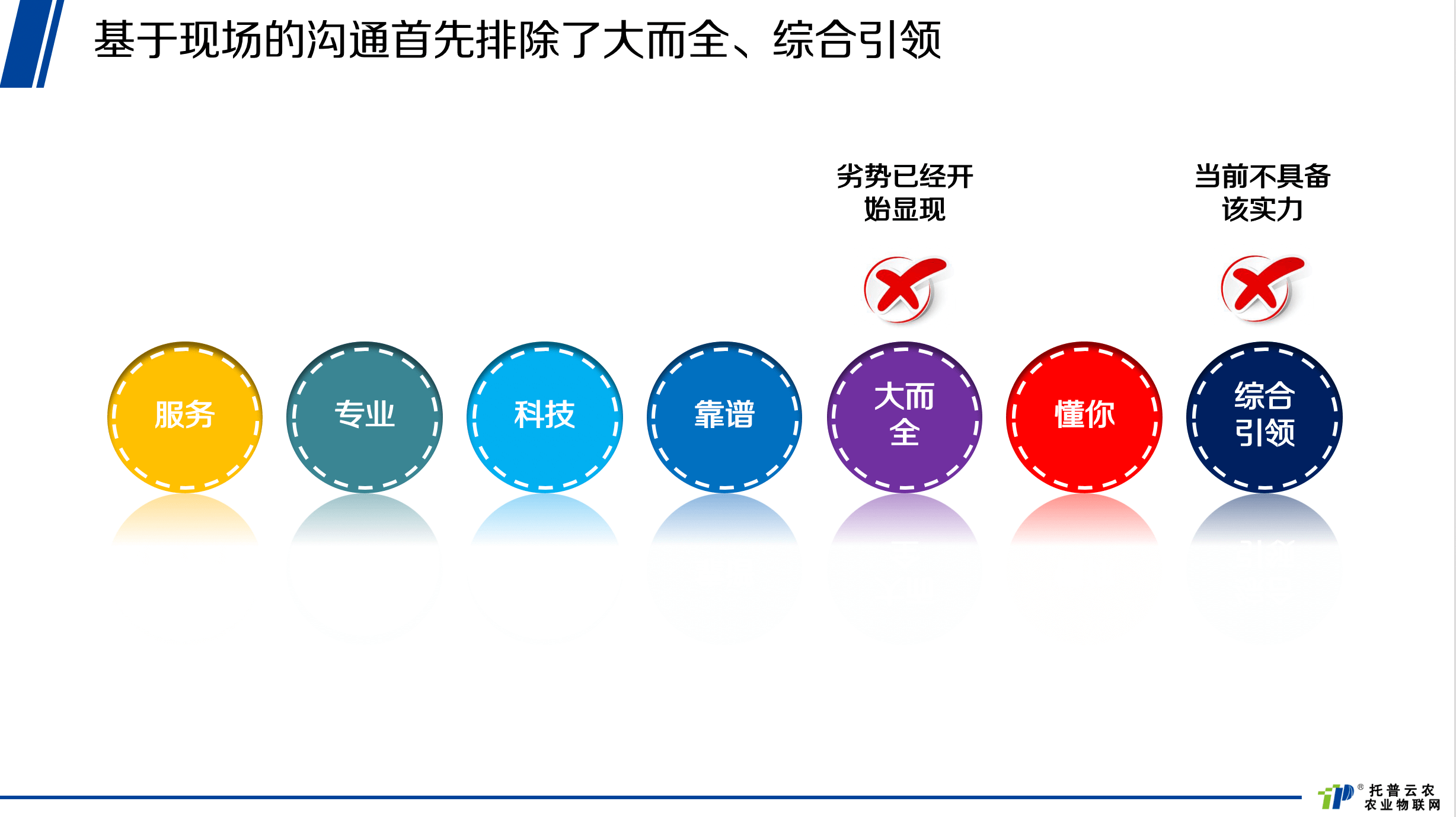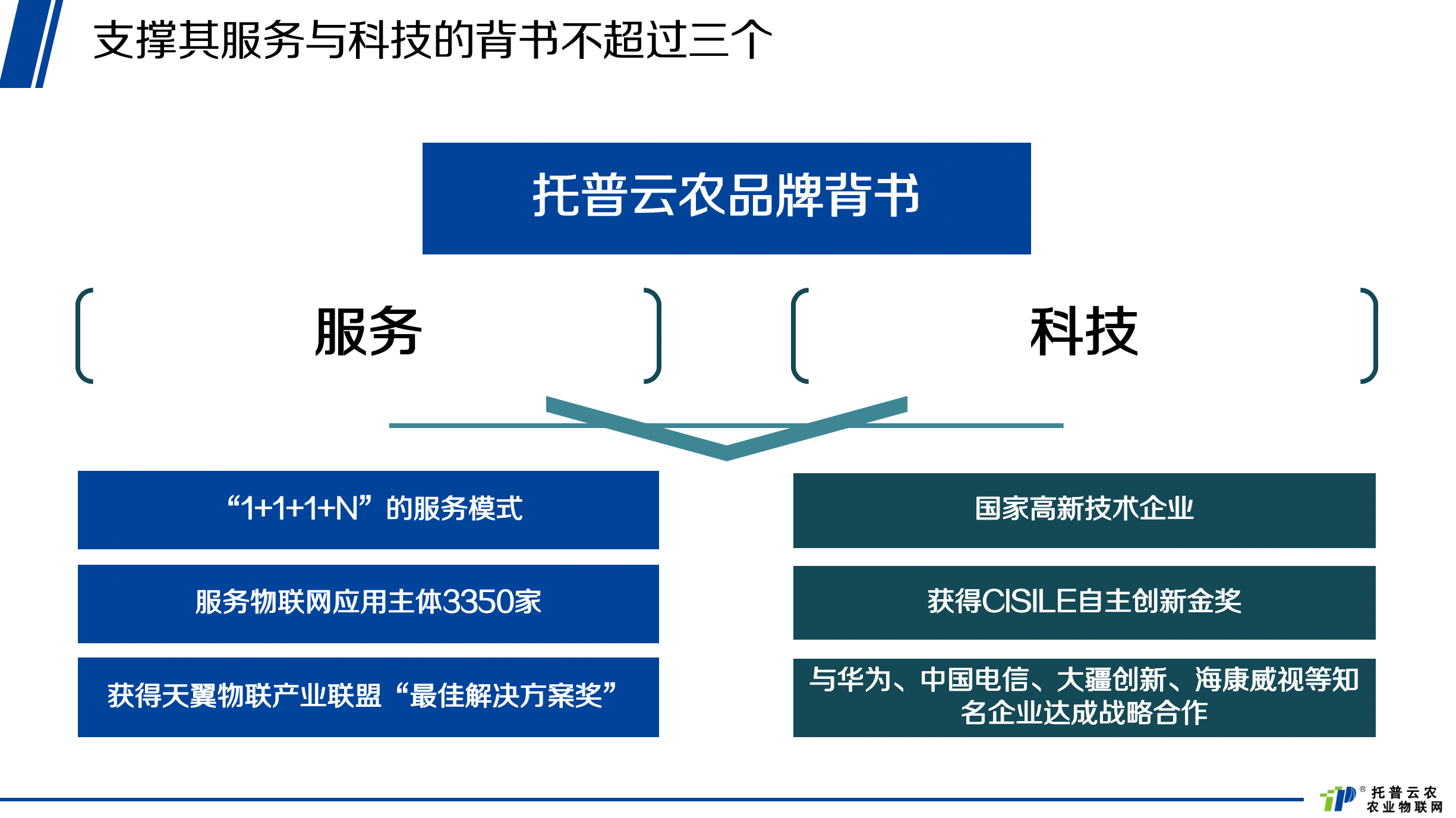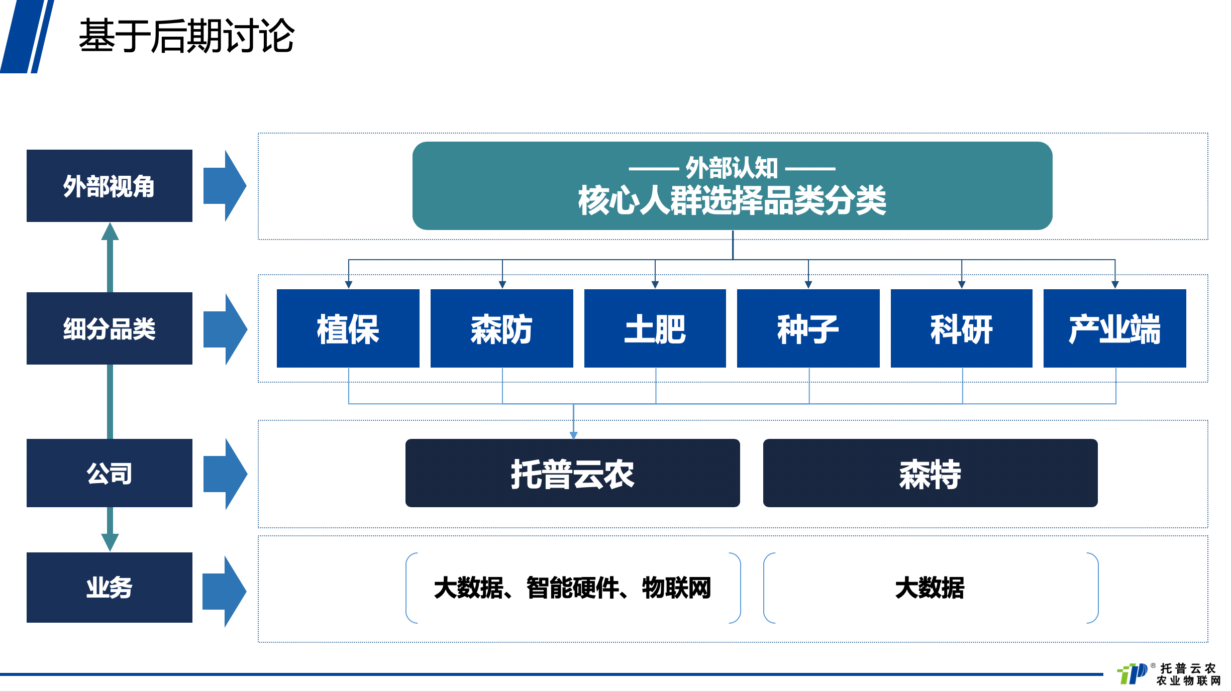 • 经过十多年的发展及沉淀,托普云农在行业内已形成一定的知名度及影响力。大家对托普云农的印象表现:业务范围大而全、地位在业内举足轻重,但却无法明确说出托普的准确定位。