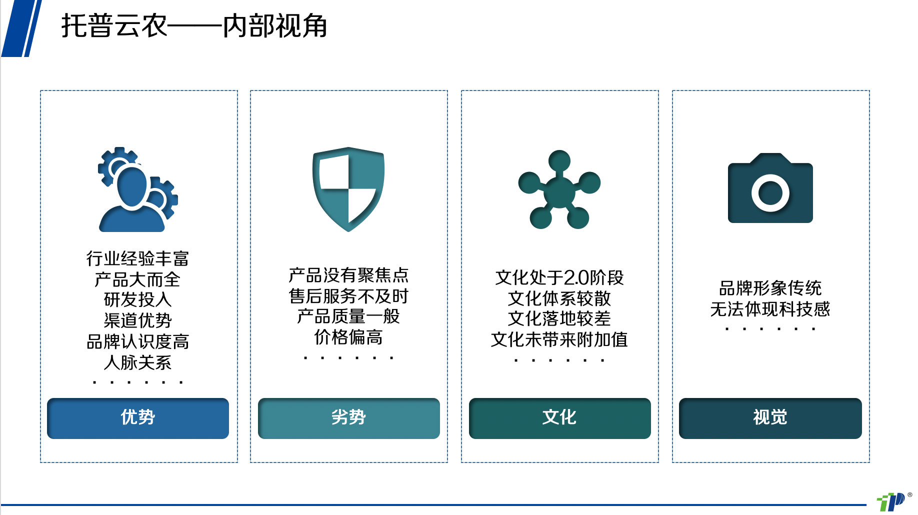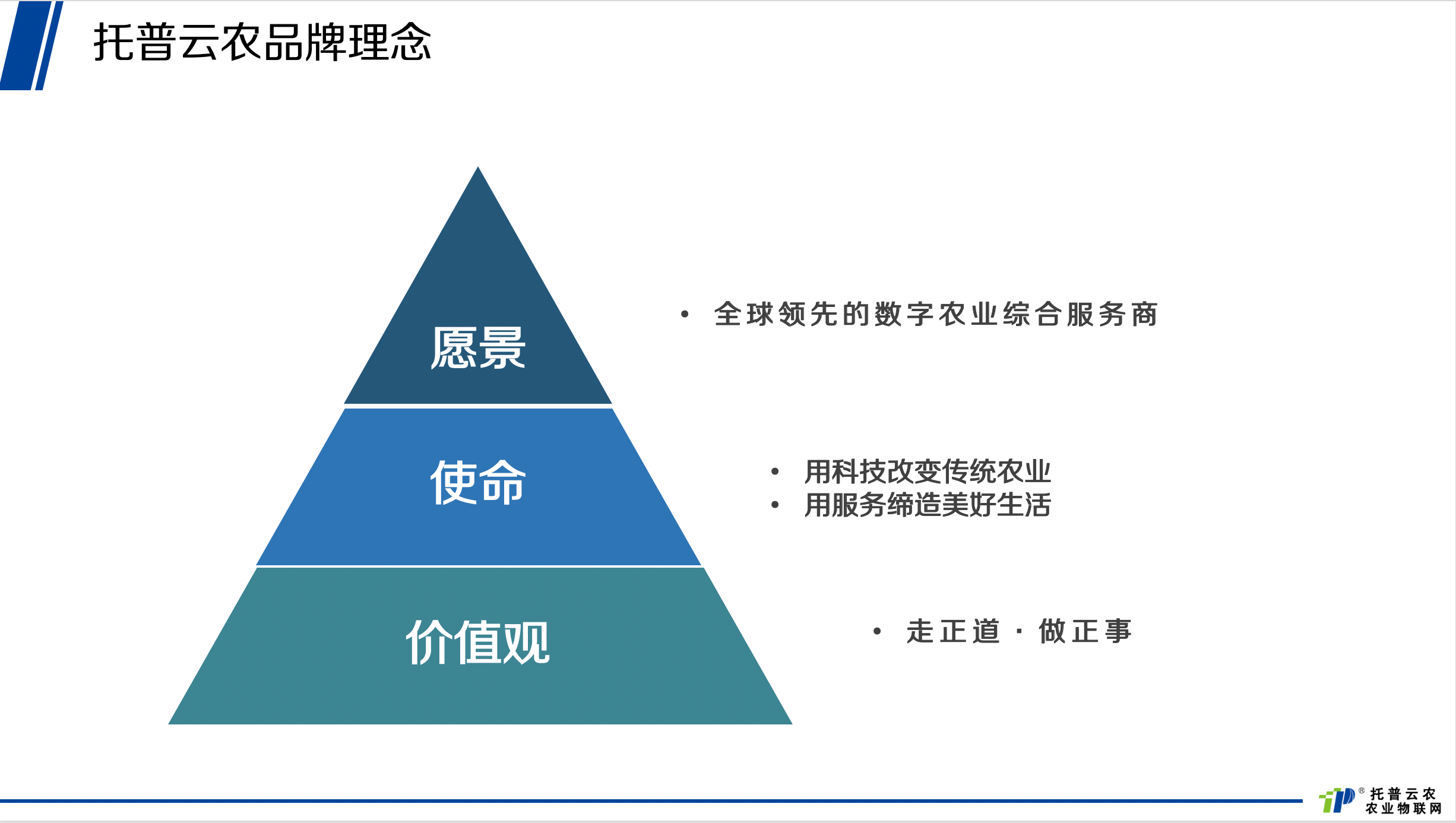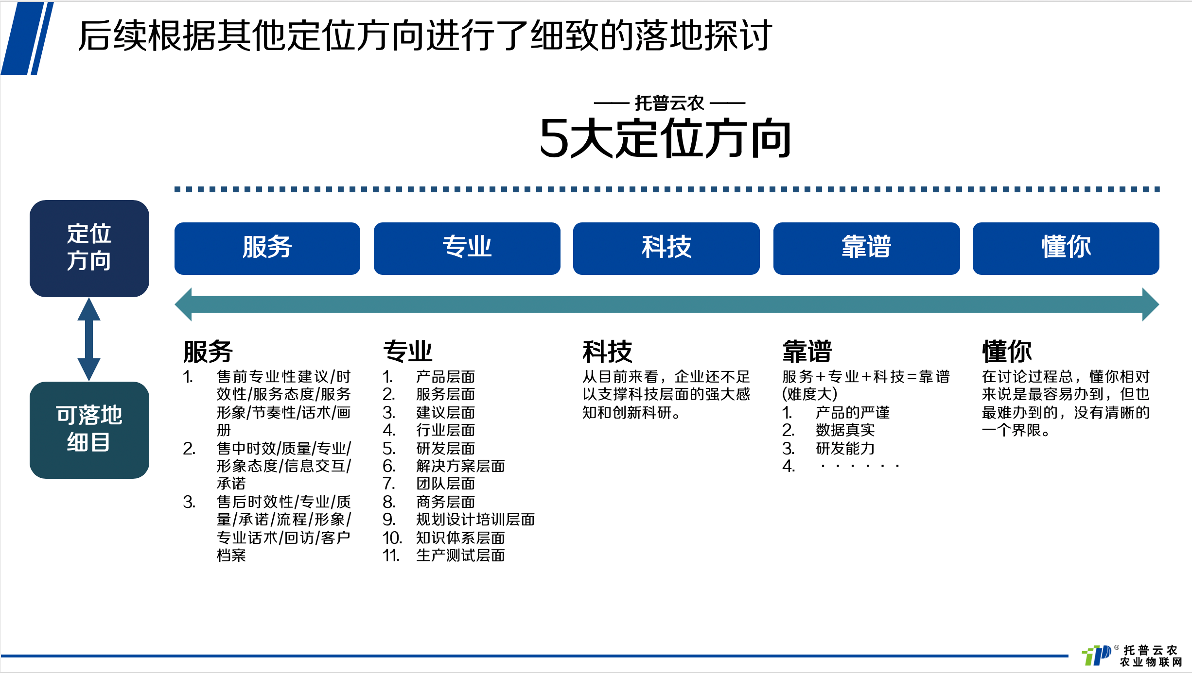• 经过十多年的发展及沉淀,托普云农在行业内已形成一定的知名度及影响力。大家对托普云农的印象表现:业务范围大而全、地位在业内举足轻重,但却无法明确说出托普的准确定位。