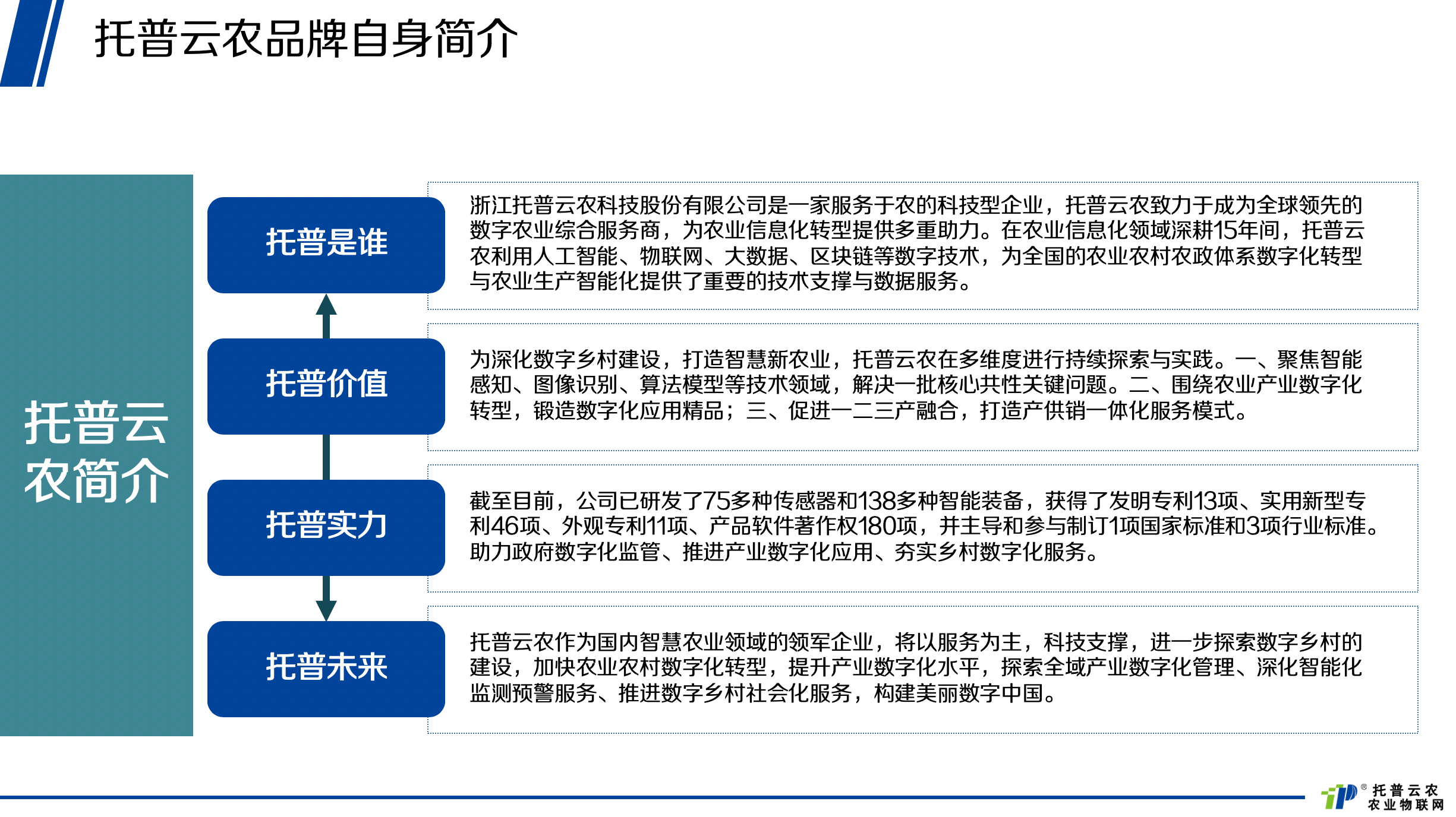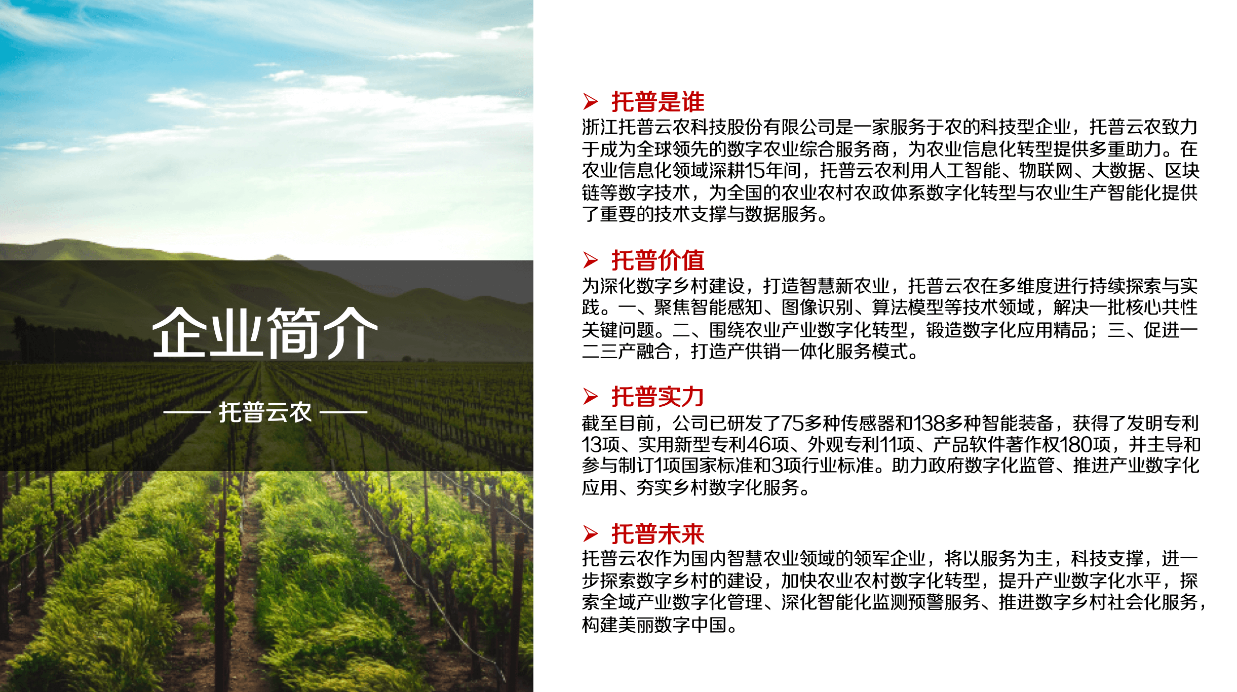 浙江托普云农科技股份有限公司是一家服务于农的科技型企业,致力于成为全球领先的数字农业综合服务商,为农业数字化转型提供多重助力。在数字农业领域深耕十余年间,托普云农利用人工智能、物联网、大数据、区块链等数字技术,为全国的农业农村农政体系数字化转型与农业生产数字化应用提供了重要的技术支撑与数据服务。