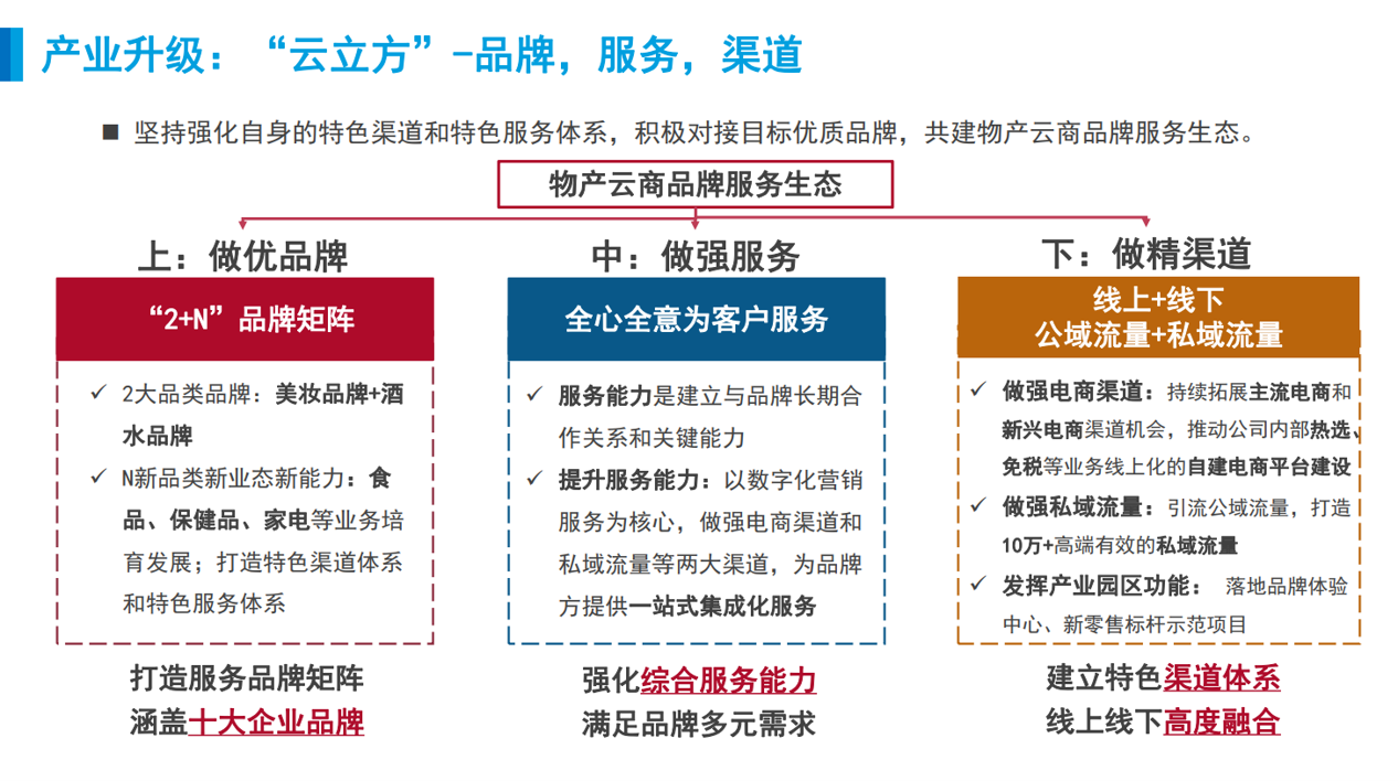 目前物产通的业务主要分两块,一块是2+N品牌服务,目前主要围绕美妆酒水家电新媒体等,跟行业的中高端品牌合作,作为他们的一个渠道供应商;另一块是渠道业务,电商化集采(目前针对一些大型国有企业)和私域流量运营。