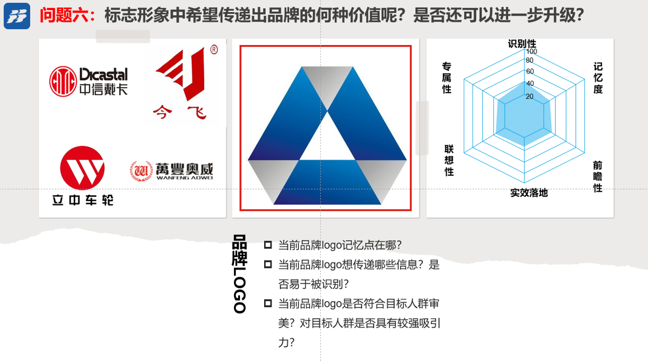6、问题六:品牌标志太过于传统,缺乏记忆点,产品联想性识别度不够,年轻化不足;
