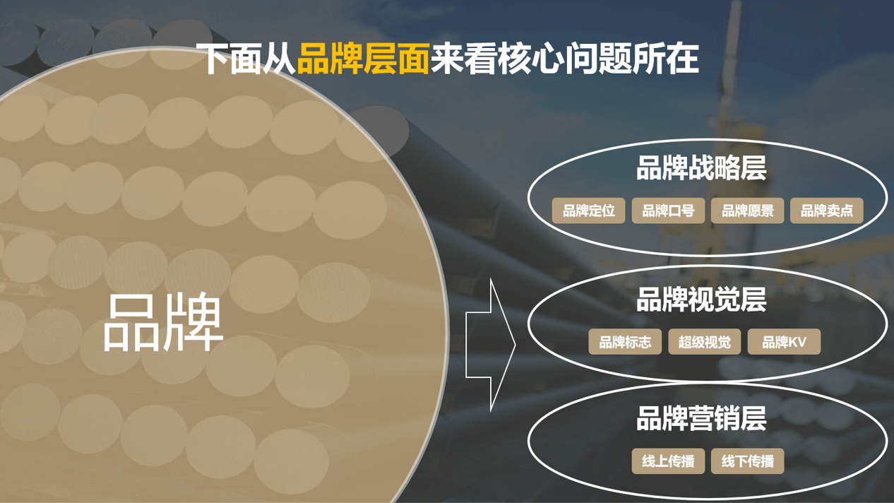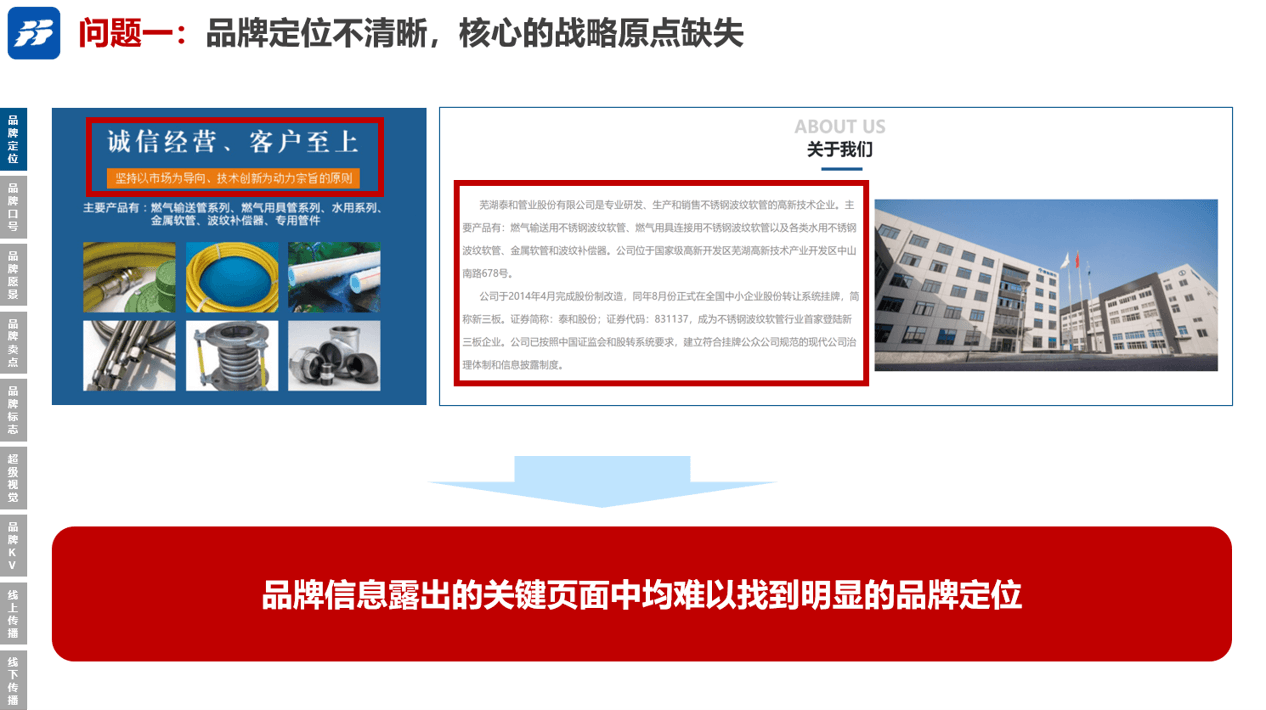 紧接着我们对品牌层面也进行了全面诊断,主要围绕战略层,视觉层和营销层进行分析。我们经过初步判断,发现品牌大定位体系中存在9大问题: