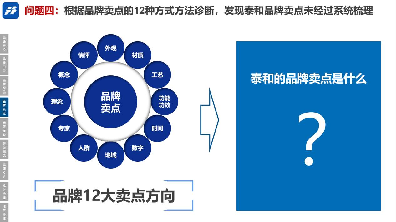 问题四:根据品牌卖点的12种方式方法诊断,发现泰和品牌卖点未经过系统梳理