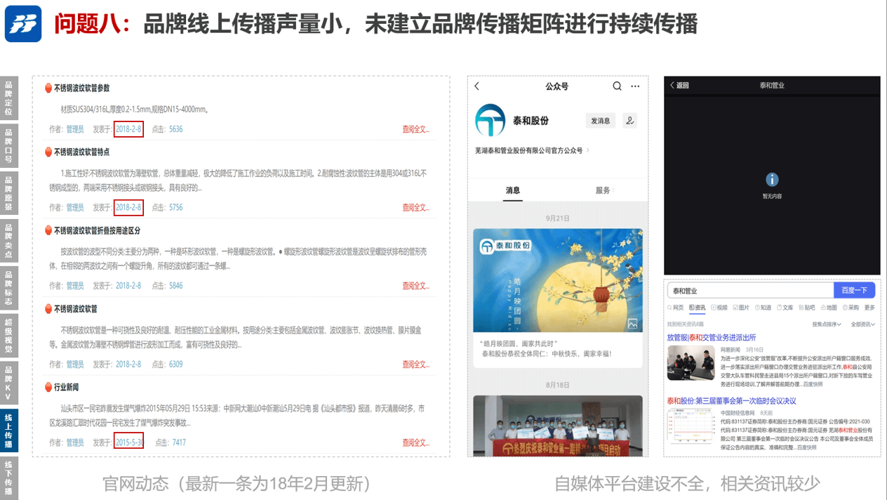 问题八:品牌线上传播声量小,未建立品牌传播矩阵进行持续传播
