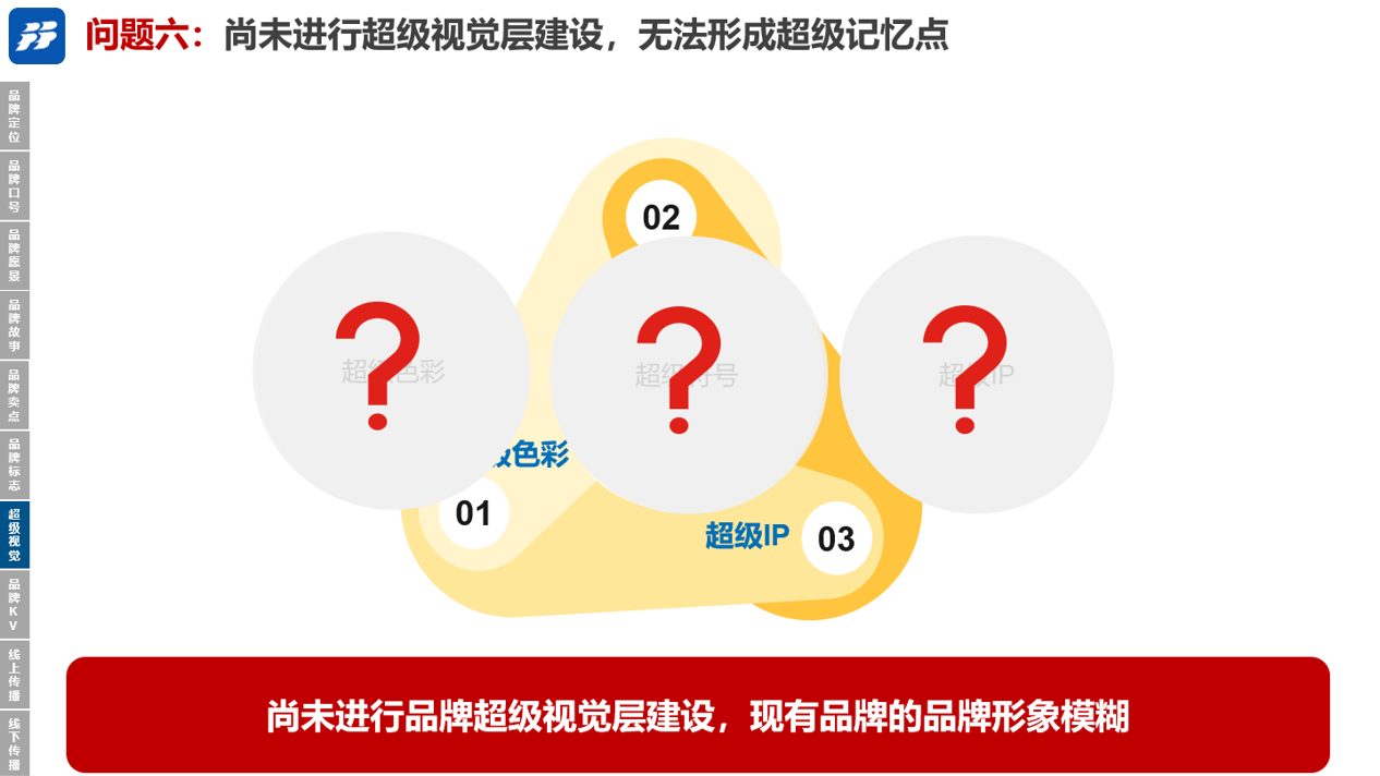 11、问题十一:尚未进行品牌超级视觉层建设,现有品牌的品牌形象模糊,超级色彩,超级符号及IP是缺失的,不易使消费者形成更深的记忆点;