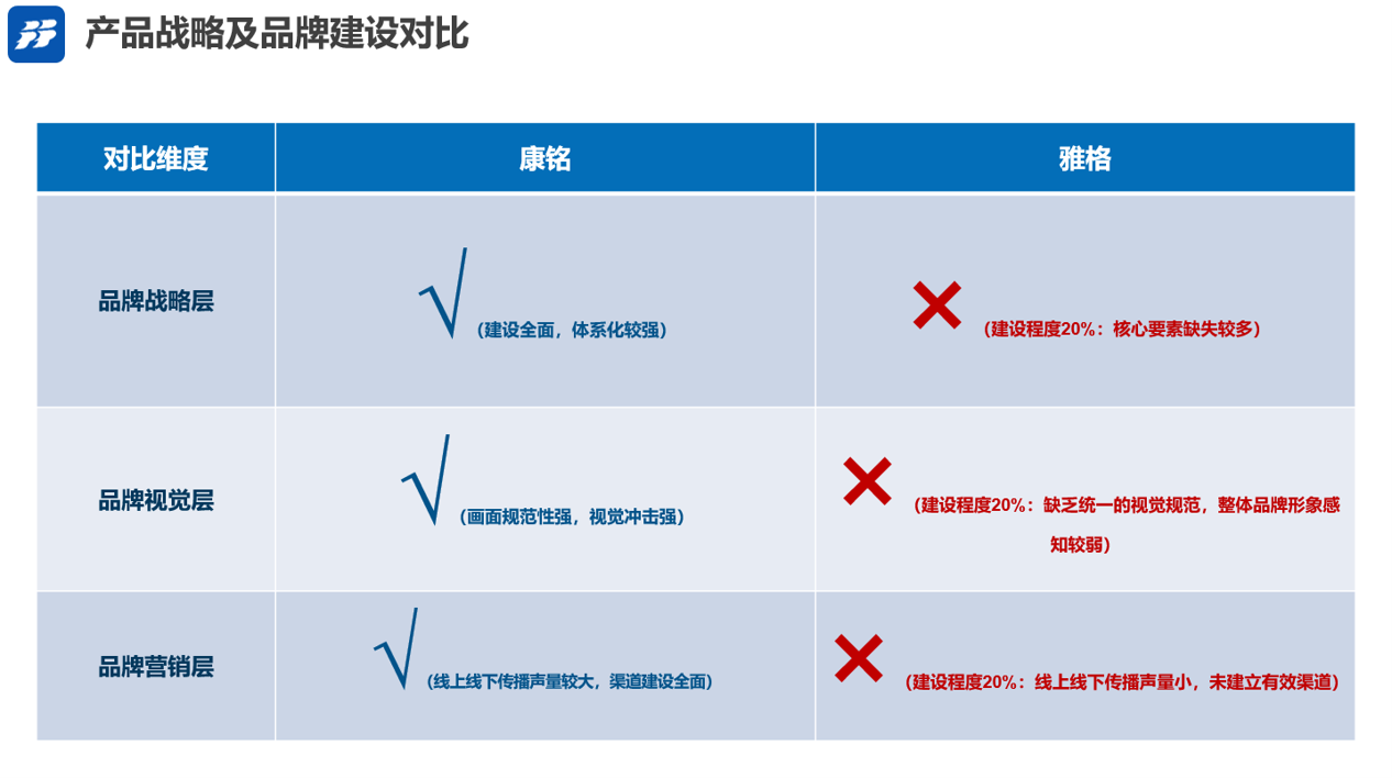 整体来看,雅格的战略体系缺失较多。我们也对比了其行业相关竞品康铭盛,便于雅格更好的理解自身的差距。我们首先可以清晰的感知到对方的定位,即健康,并在后续的各类落地事项中均围绕健康持续发力,视觉上,通过鲜亮的橙黄色,传递出一种阳光,健康的感知。营销层面线上线下双驱动,不断提升品牌知名度。横纵对比来看,雅格不论是在战略层还是视觉层,都需要完善!