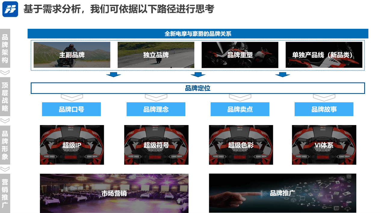 我们首先对第一个核心问题进行分析,对豪爵来说,四种品牌架构策略是需要重点思考的,第一个是主副品牌,第二个独立品牌,第三个是对燃油摩托品牌豪爵进行重塑,第四个就是在豪爵品牌之下划分出一条全新的产品线,仍沿用豪爵品牌。我们逐一分析了每类策略的企业适用要素,并对行业现状进行了分析,电摩市场发展前期好、市场格局未定,是当前市场的主要特征,同时基于豪爵具备发展原生优势,拥有国内最大的燃油两轮车企业强实力的背书支撑。基于外部内部的考量,可能需要以主副或独立的品牌进入市场。因为电摩托是未来行业发展趋势,且为企业发展的重要战略方向,在行业趋势利好、市场竞争格局未定的情况下,应利用企业现有优势,通过系统性品牌建设迅速打响电摩托品牌知名度,形成强有力的品牌竞争力,从而占领更多的市场份额。