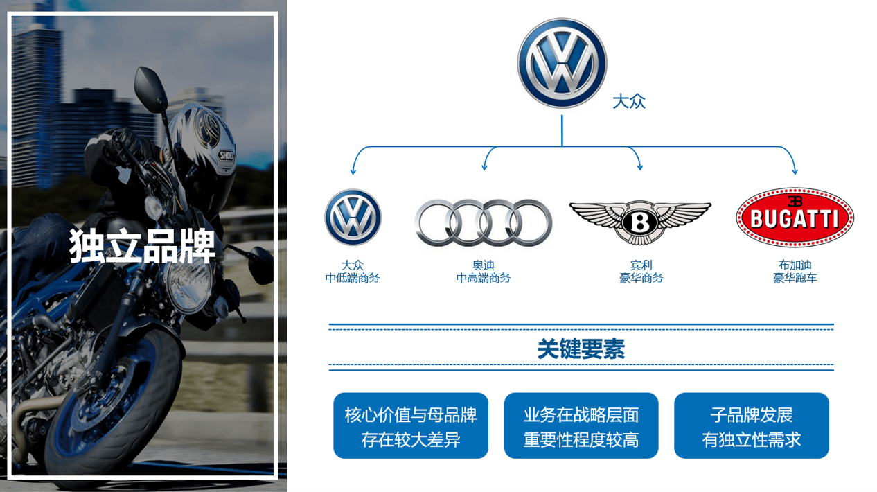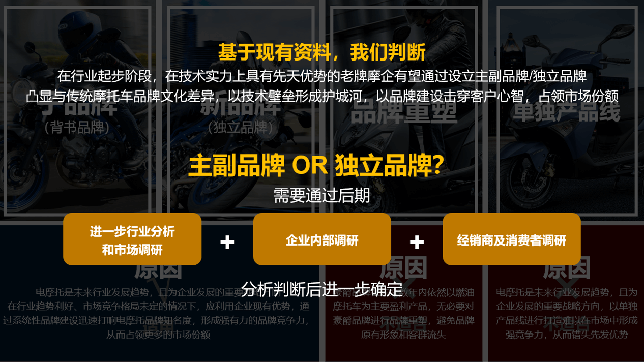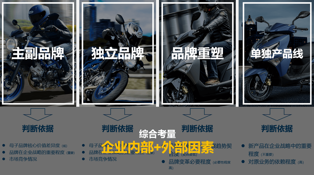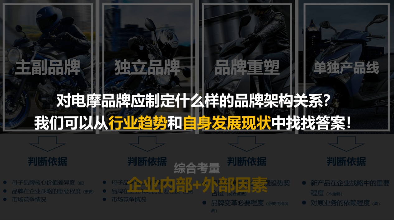 第一个核心问题就是作为国内最大燃油两轮车企业,全新开辟的电动两轮车独立事业体应如何进行品牌架构打造?