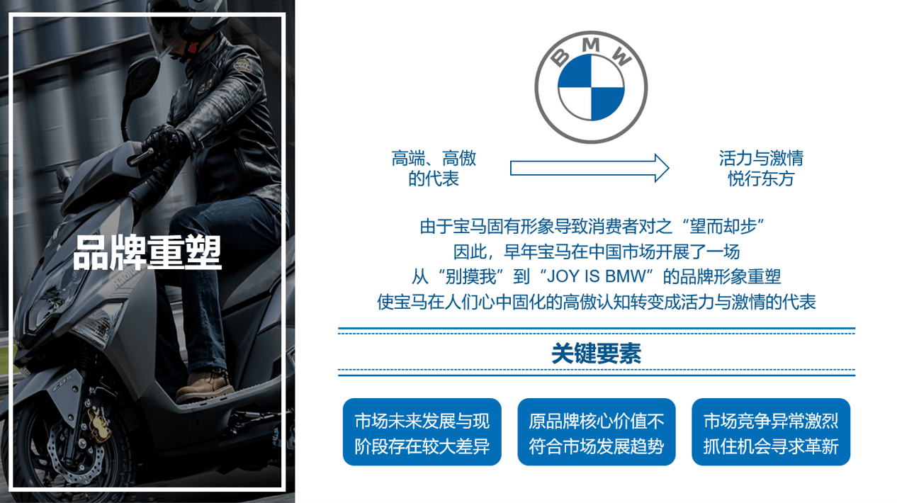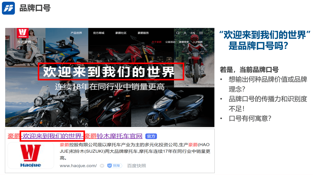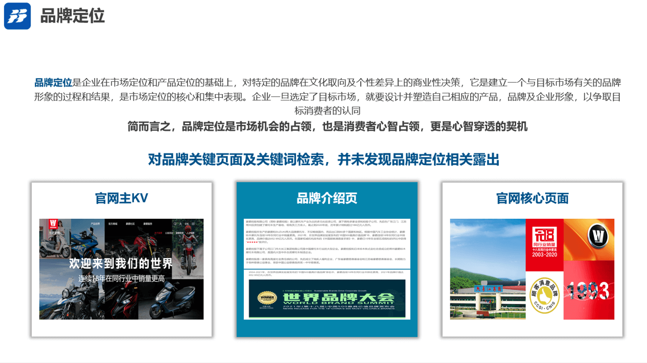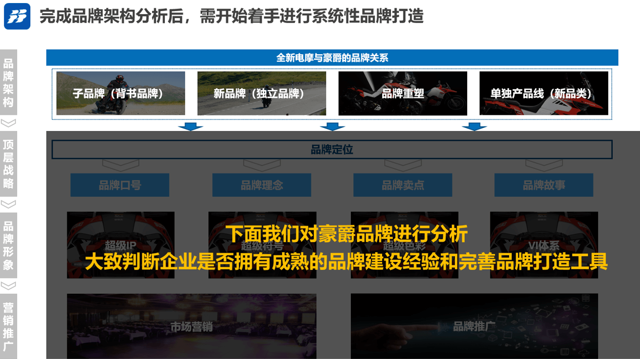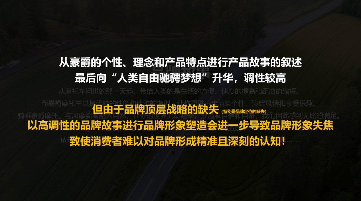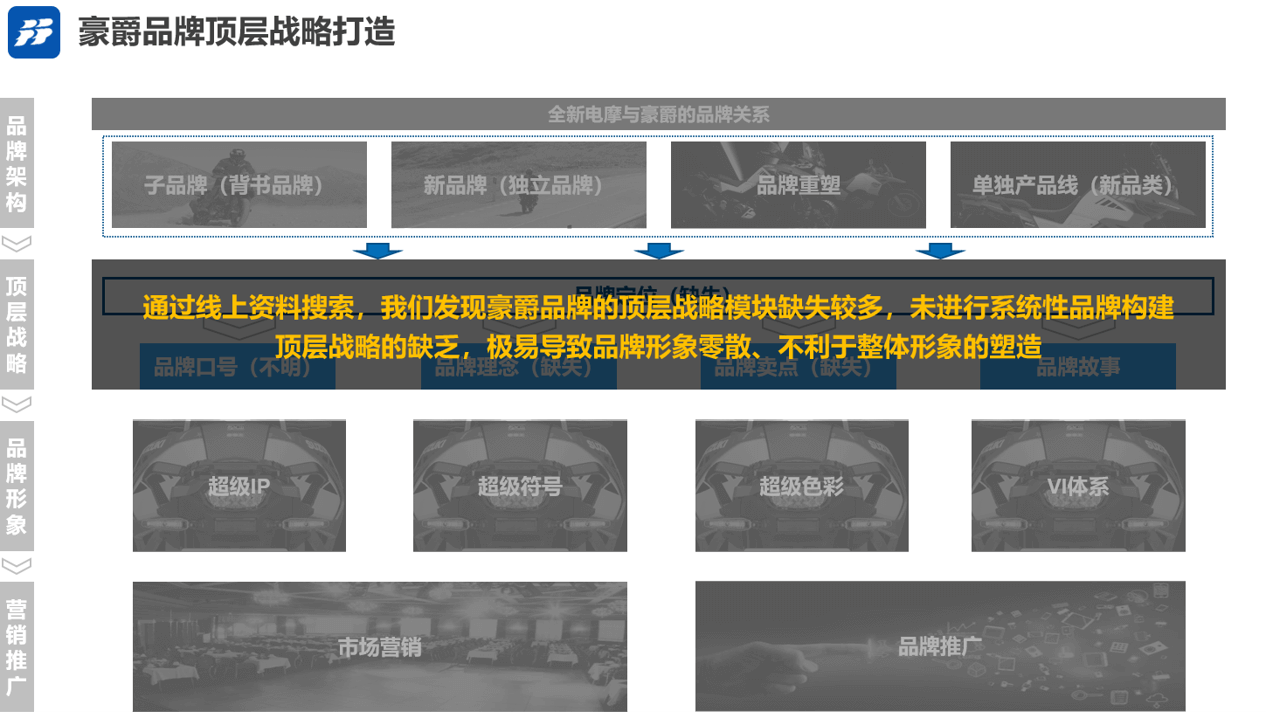 那么第二个问题如何解?新品牌如何塑造?我们先对豪爵目前的现状做了剖析,我们发现豪爵品牌的顶层战略模块缺失较多,未进行系统性品牌构建,顶层战略的缺乏,极易导致品牌形象零散、不利于整体形象的塑造。在过往的品牌建设过程中,可见豪爵存在诸多不足,需要通过一套系统来解决!