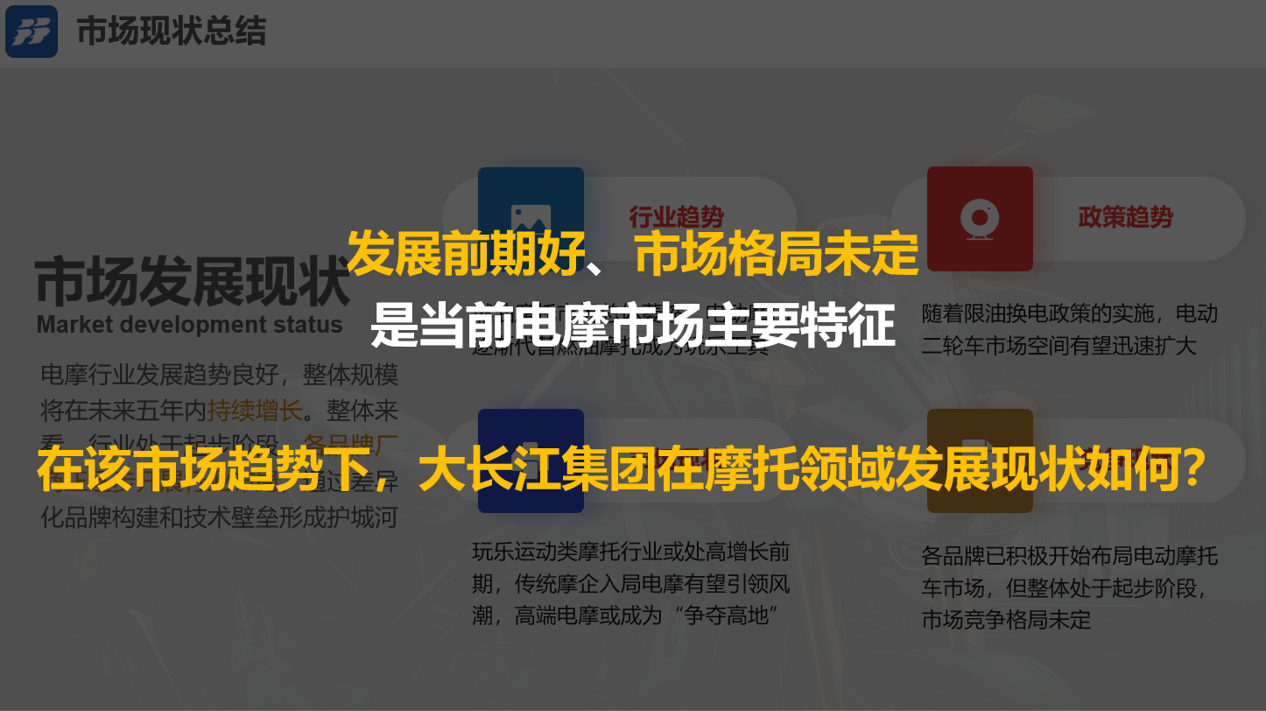 作为中国摩托⻋的领导品牌之⼀,大长江集团持续且积极的响应国家节能减排政策,除了在摩托⻋领域研发更加节能省油的产品,在电动⻋领域也⼀直在思考,应该提供给⽤⼾什么样的产品,既能兼顾品质、性能,⼜能与价格取得良好的平衡。现在大长江集团希望发力电摩市场,需要两大核心问题。
