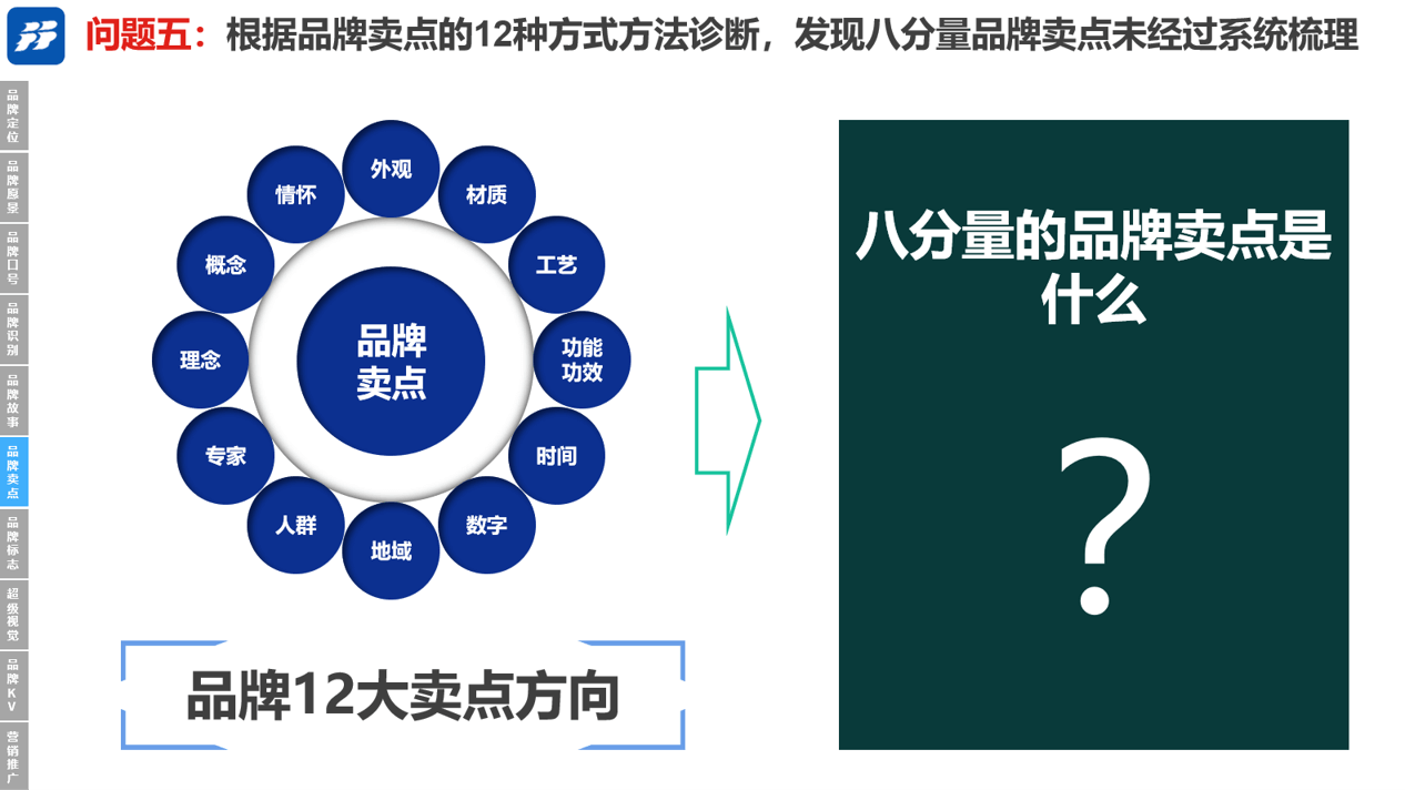 问题六:根据品牌卖点的12种方式方法诊断,发现八分量品牌卖点未经过系统梳理