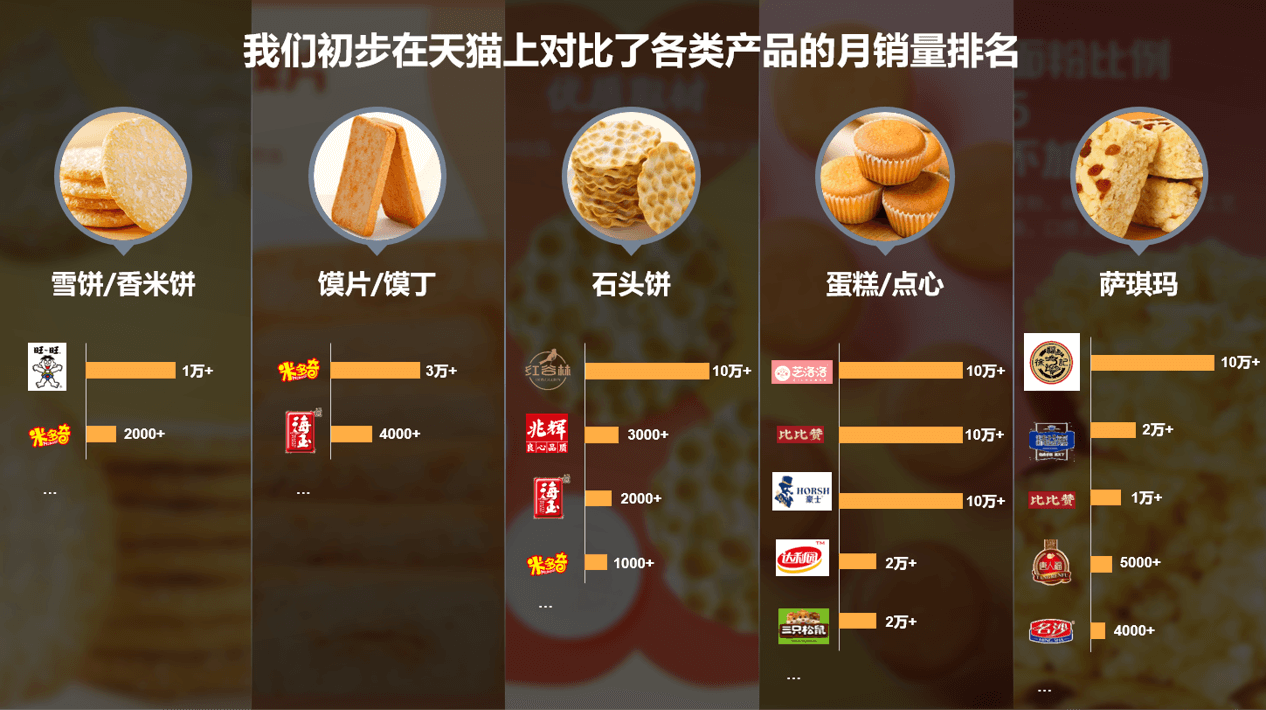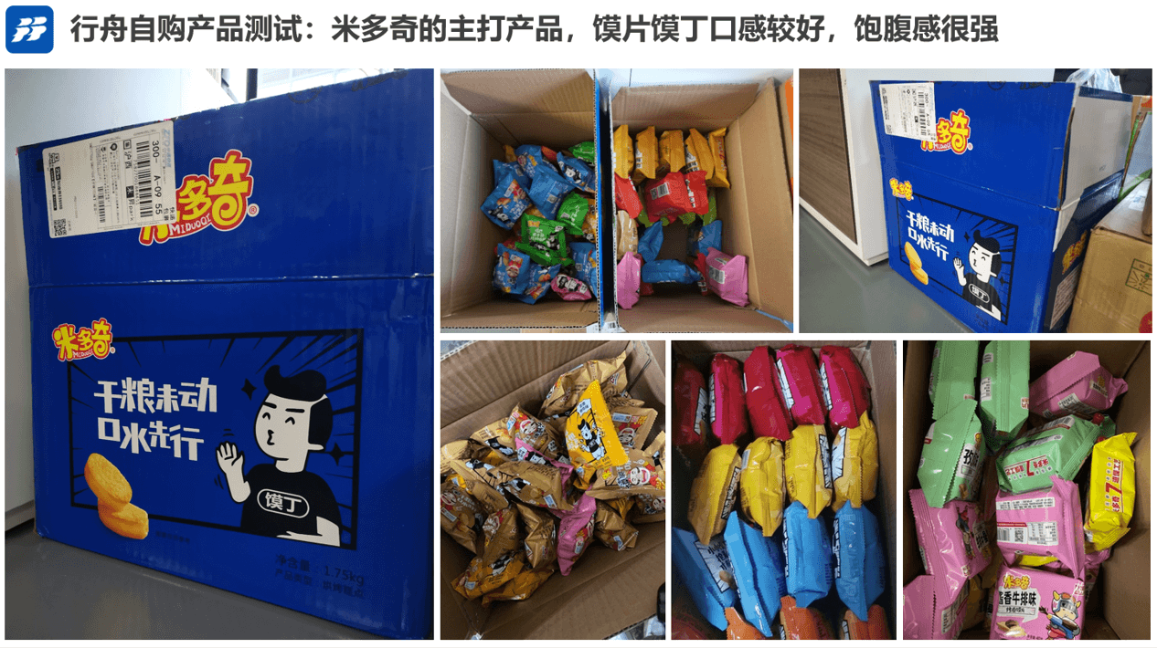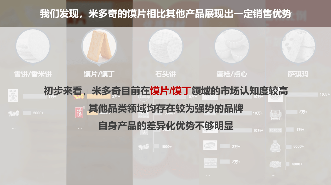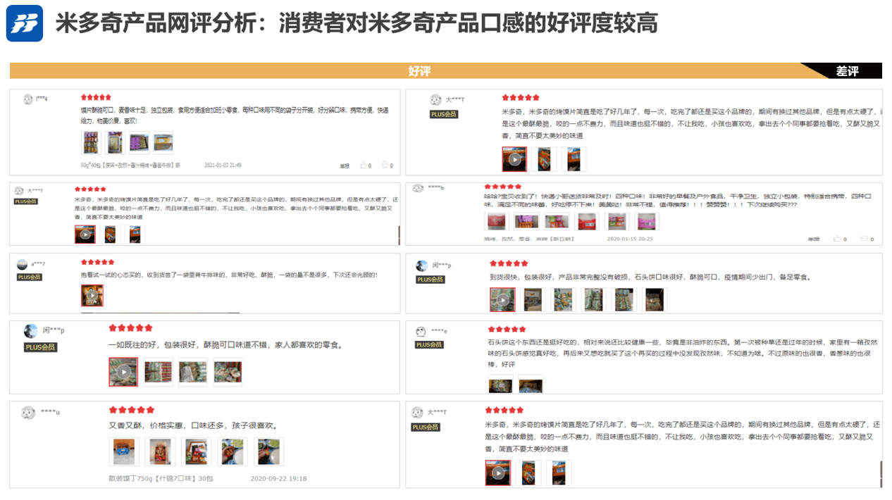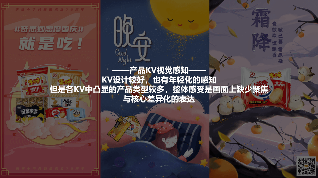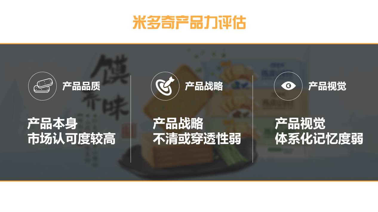 初步来看,米多奇目前在馍片/馍丁领域的市场认知度较高,其他品类领域均存在较为强势的品牌,自身产品的差异化优势不够明显。通过网络测评,我们发现,消费者对米多奇产品口感的好评度较高,在品质层面得到市场一致认可,但是在产品战略及视觉层面,仍存在一定的问题。