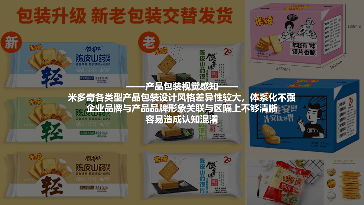 问题三:米多奇各类型产品包装设计风格差异性较大,体系化不强,企业品牌与产品品牌形象关联与区隔上不够清晰,容易造成认知混淆。
