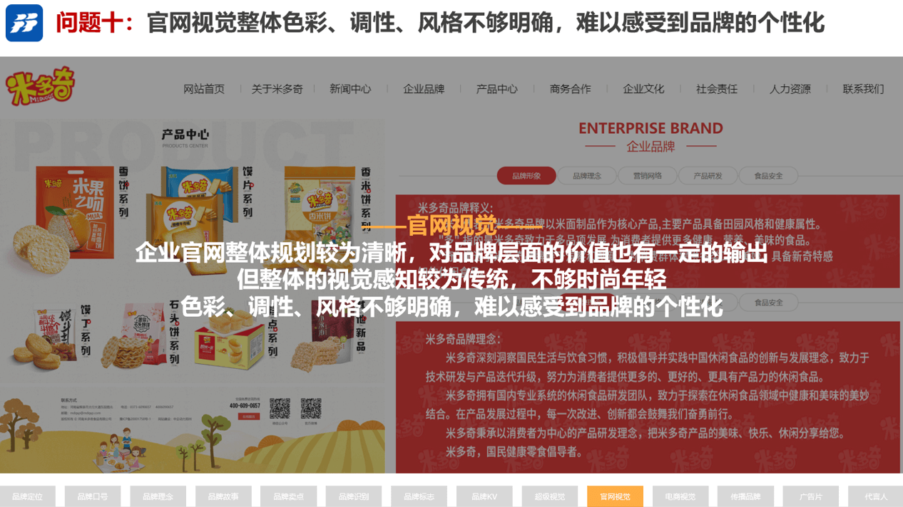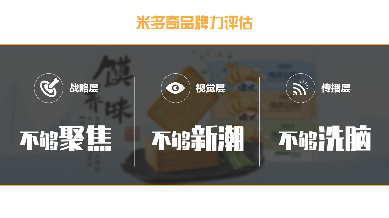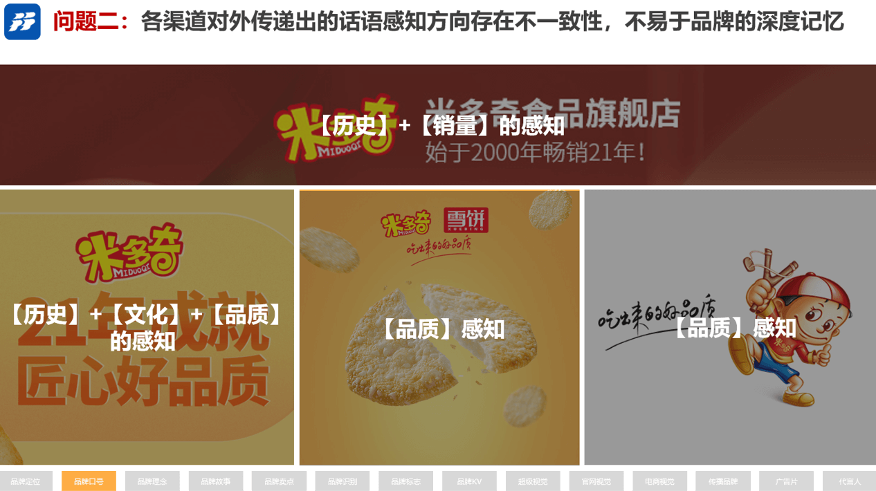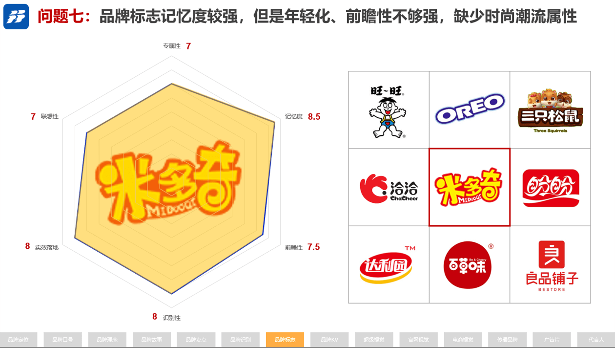 整体总结来看,对米多奇的产品力评估结果总结为三点:产品本身市场认可度较高,产品战略不清或穿透性弱,产品视觉体系化记忆度弱。那么,我们再来看下品牌力存在的问题: