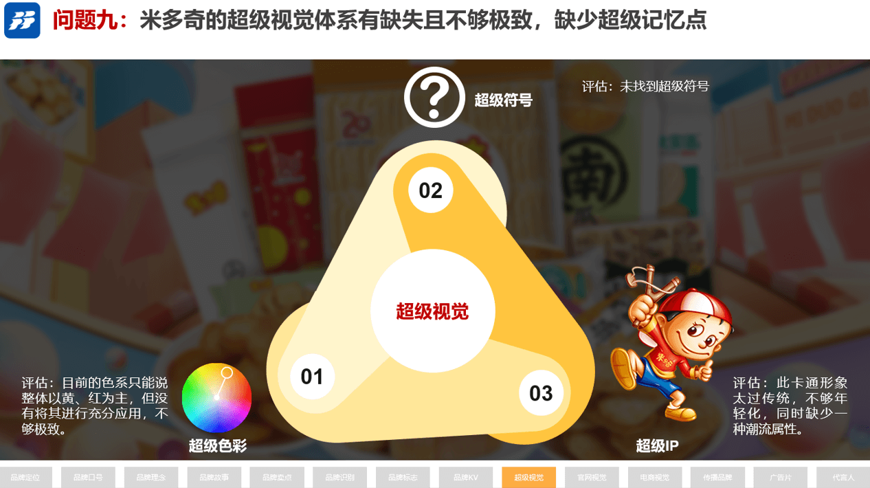 问题九:米多奇的超级视觉体系有缺失且不够极致,缺少超级记忆点;