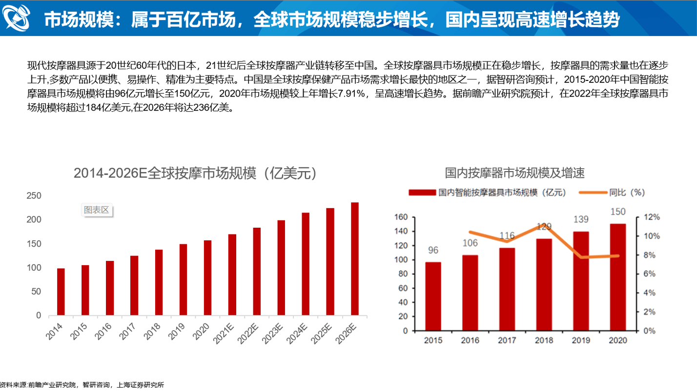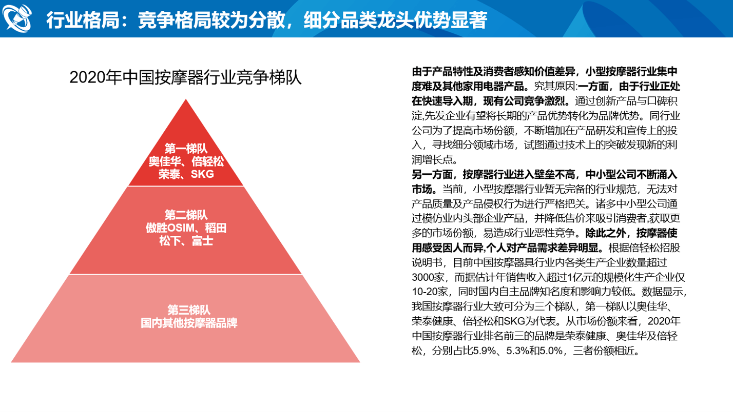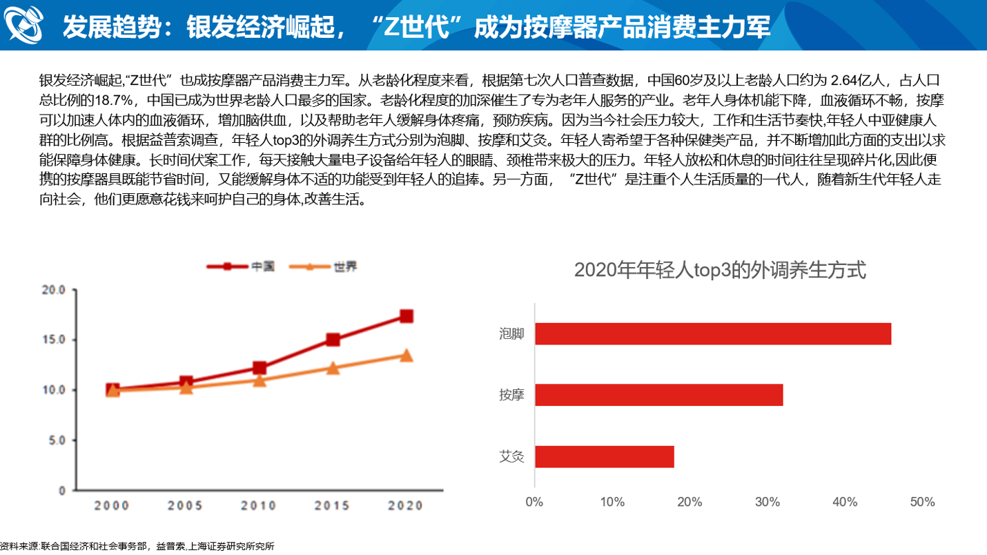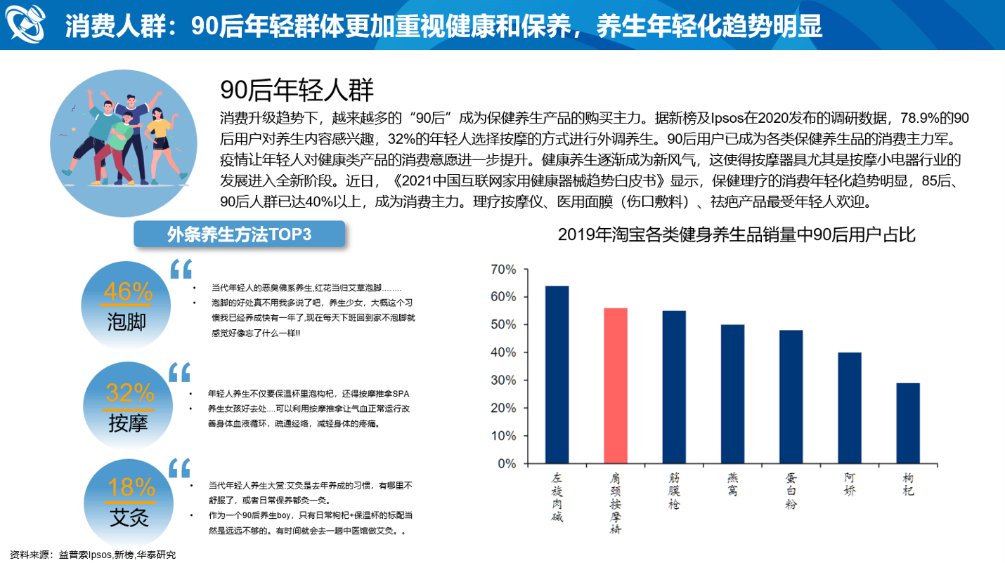 就按摩仪领域来说,全球市场规模稳步增长,国内呈现高速增长趋势,小型按摩器具渗透率低,潜在空间广阔,且竞争格局较为分散,细分品类龙头优势显著。消费升级趋势下,越来越多的“90后”成为保健养生产品的购买主力,养生年轻化趋势明显,并且由于年轻消费者工作压力大这一特征,超过50%的打工人将缓解腰椎/颈椎痛的希望寄托于按摩仪器,加之,崛起的银发经济也在成为按摩器产品消费主力军。总体而言,整体行业是非常向好的,那么倍益康此时全面升级品牌,依然存在较大的机会。