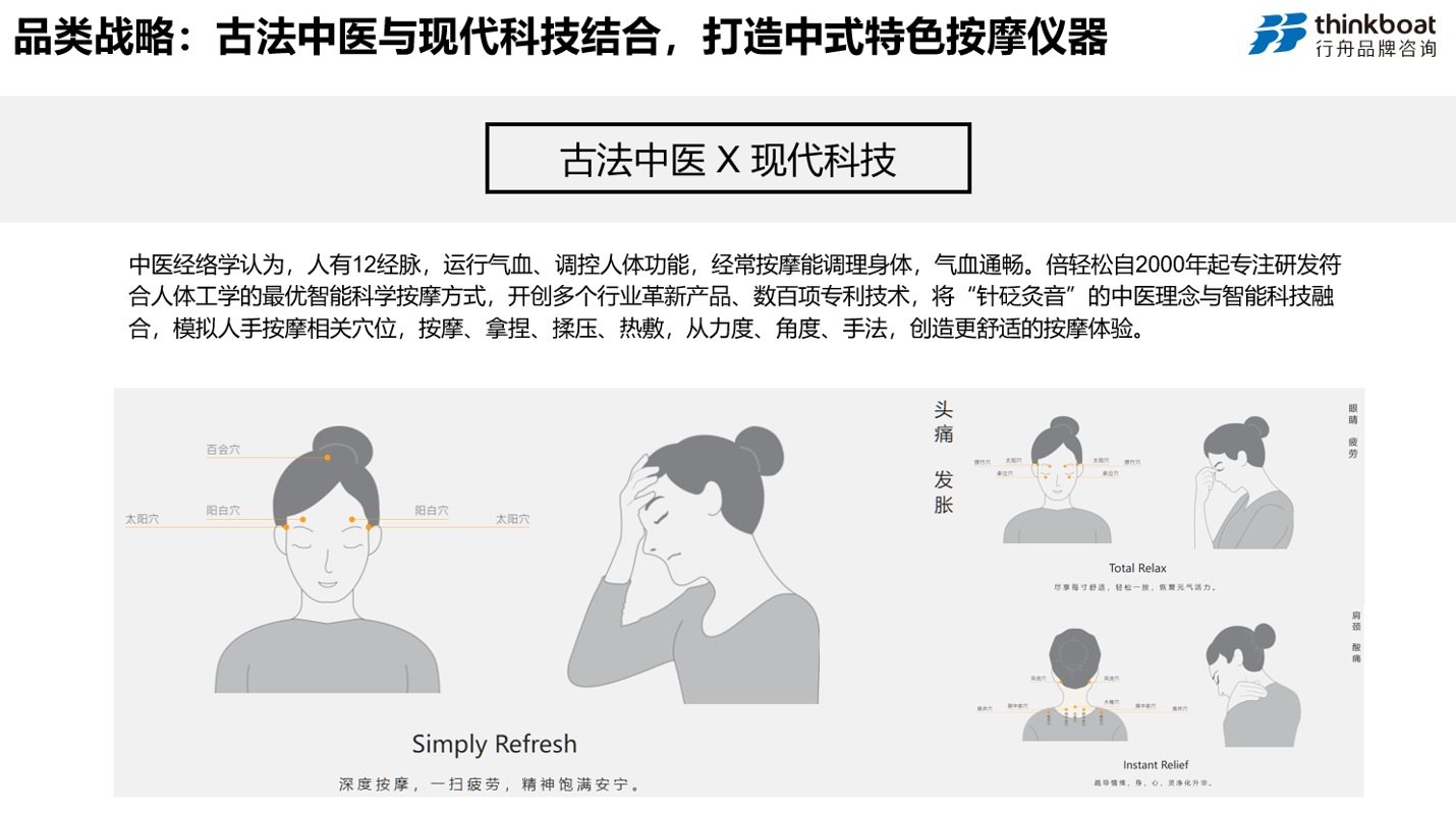倍轻松品牌体系也较为完善,其中在产品力上大做文章,结合全面推广,打开市场。倍轻松定位【便携、智能】,对外传递“智能便携按摩器“的口号,在品类上战略创新,将古法中医与现代科技结合,打造中式特色按摩仪器。人性化产品设计适应各细分按摩场景,很好的品牌印象深度植入产品中。对外的视觉型线上,是一种极简的风格,体现轻便,放松,便捷智能的定位较为一致。品牌的直营门店分布机场、高铁站及中高端商场,与目标群体吻合,营销上,重视洞察年轻群体的日常和习惯,不断与年轻人对话,邀请潮流明星及国家运动员,触达目标人群,扩大消费群体,整体的策略是多层次亮点全线出击,引爆品牌声量势能。各类新营销布局,跨界合作提升品牌调性。