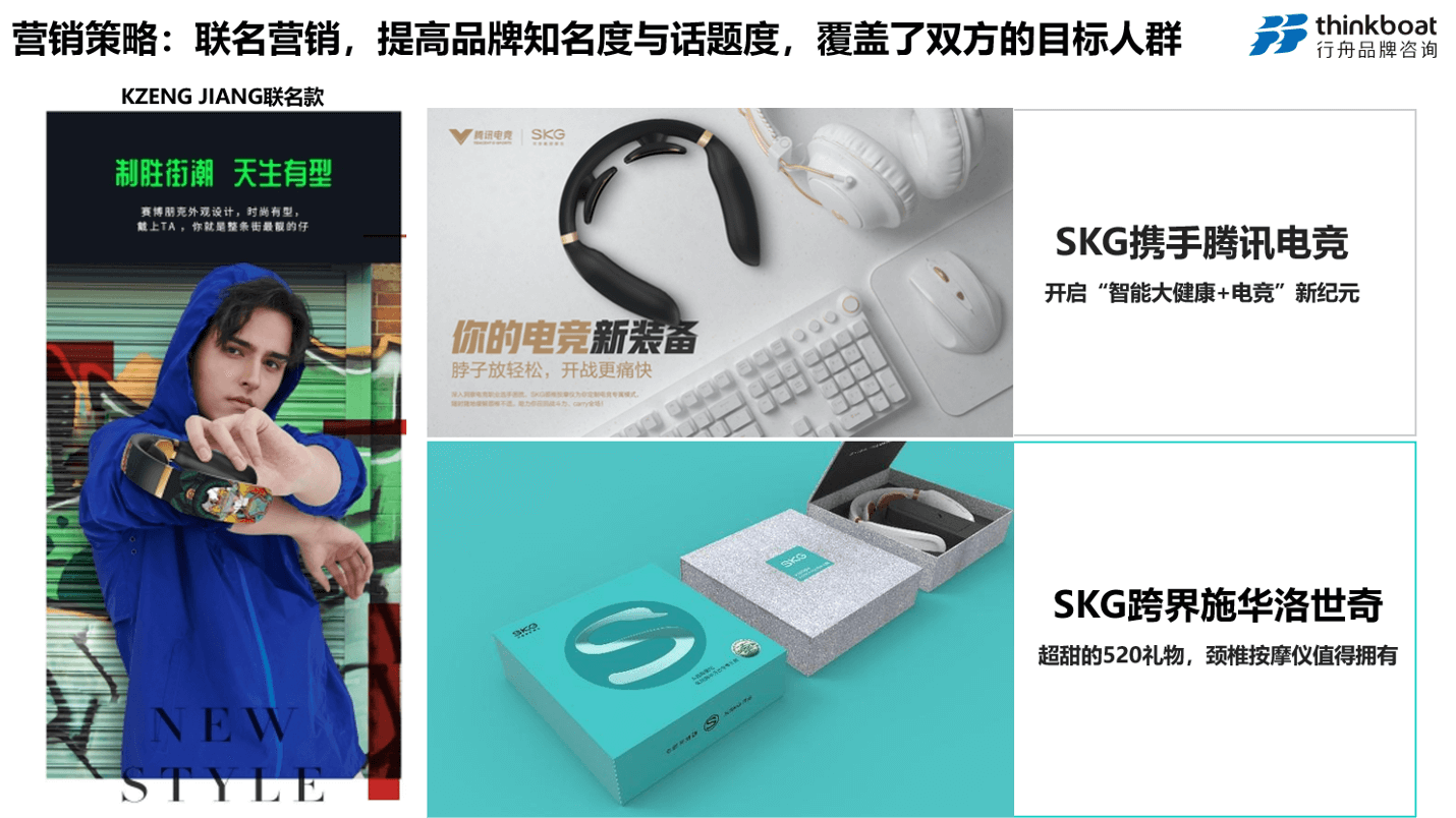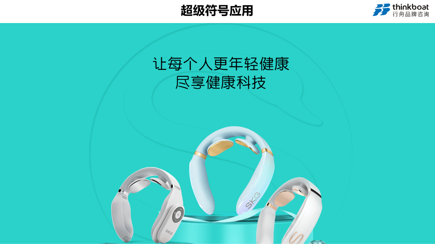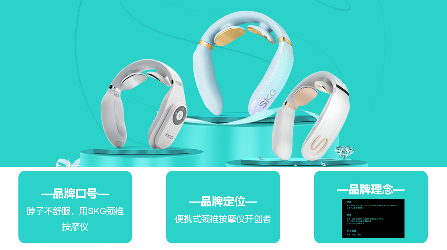 而SKG则在品牌体系化构建的同时,在视觉层面做足文章,将品牌与时尚单品画上等号,结合年轻化营销组合,快速打开市场。SKG的核心定位是【便携式颈椎按摩仪开创者】,口号“脖子不舒服,用SKG颈椎按摩仪“,品牌通过辨识度极高的蓝绿色进行色彩占位,快速吸引消费者眼球,并且提炼出“S”作为超级符号,健康优雅的脖子以“天鹅颈” 来形容,而天鹅脖子是S的形状,以此来强化品牌的识别度和记忆度,这品牌价值深度捆绑,整体统一度高。营销上,以年轻的潮流明星——王一博,娜扎,做为代言人,精准触达目标人群,赞助时下流行综艺节目,提高知名度,贴合目标人群;通过当红潮流明星体验,向消费者传达品牌时尚的属性;借助联名营销,提高品牌知名度与话题度,覆盖了双方的目标人群。