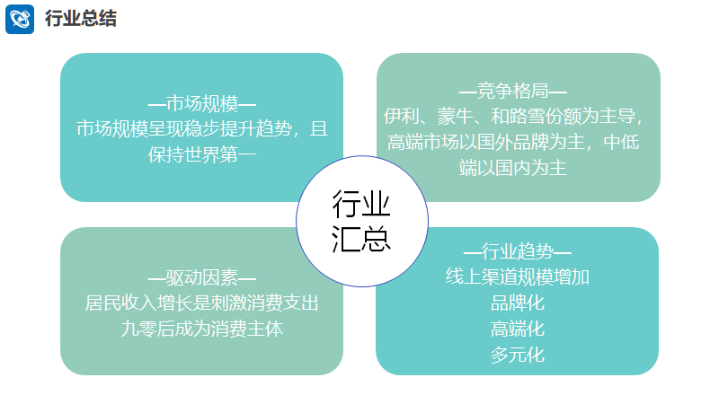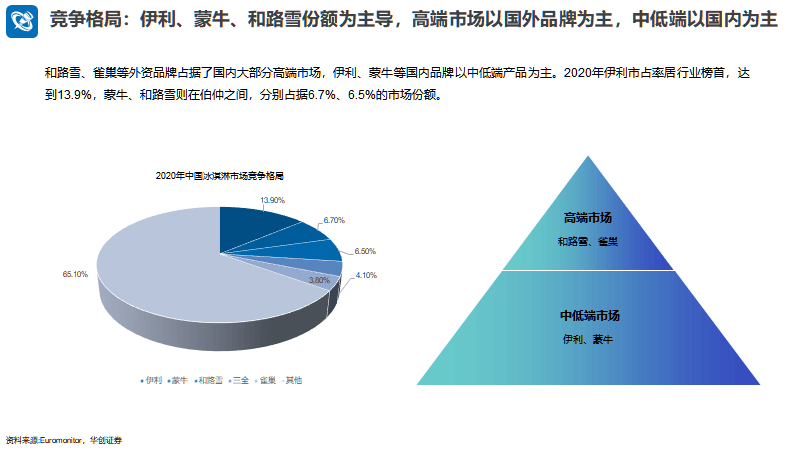 竞争格局:伊利、蒙牛、和路雪份额为主导,高端市场以国外品牌为主,中低端以国内为主;
