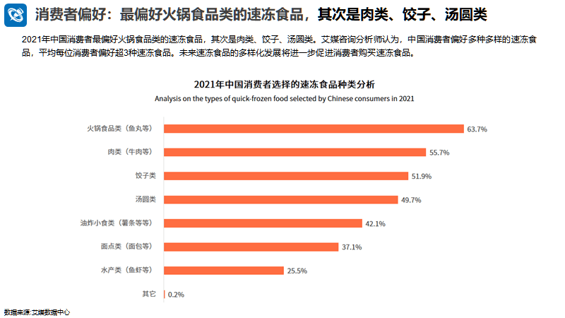 消费者偏好:最偏好火锅食品类的速冻食品,其次是肉类、饺子、汤圆类;