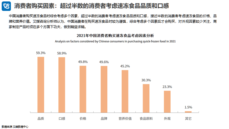 消费者购买因素:超过半数的消费者考虑速冻食品品质和口感;