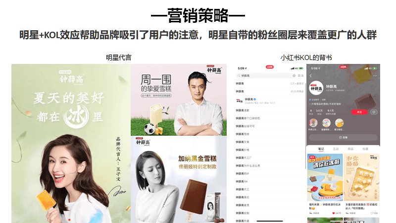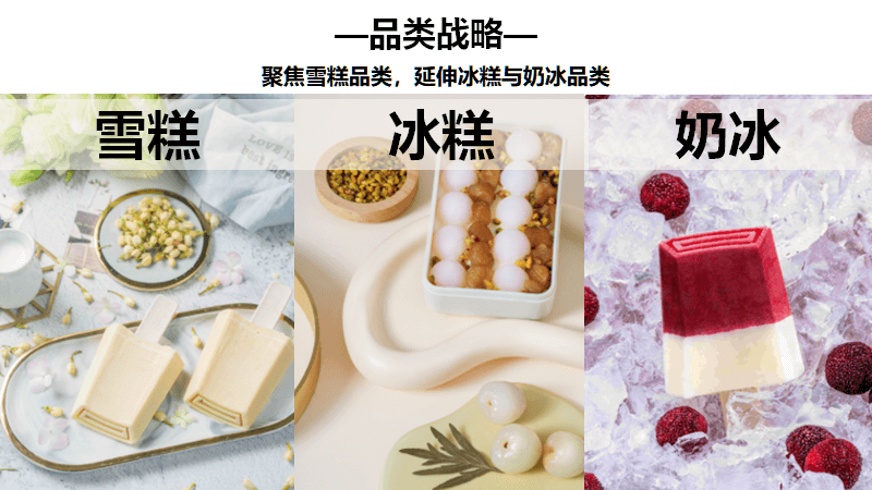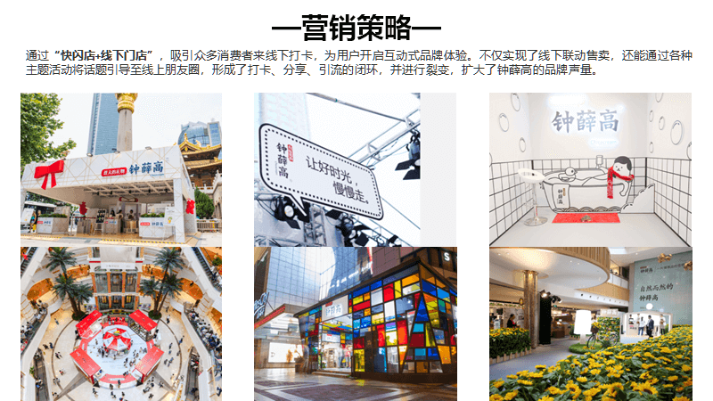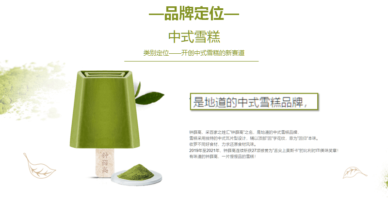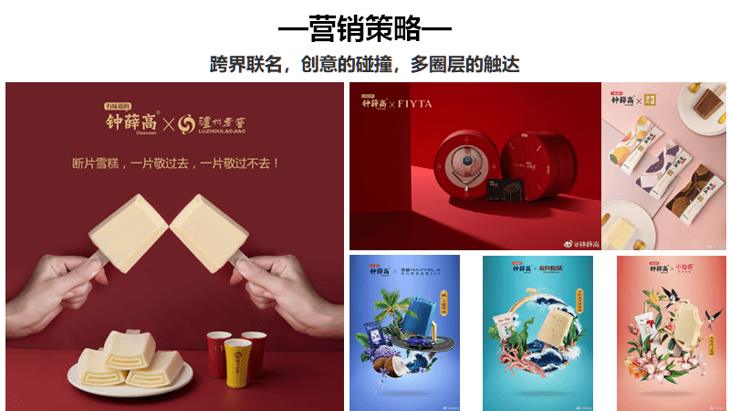 钟薛高围绕品牌定位——中式雪糕,品牌理念诠释品牌的个性,品类上聚焦于雪糕,延伸品类分别是冰糕和奶冰,品牌视觉上,超级符号以中式瓦片型设计,辅以顶部“回”字花纹,意为“回归”本味,中国风的呈现是品牌整体统一。营销上,通过“快闪店+线下门店”、跨界联名、“明星+KOL”’效应,精准触达目标人群。