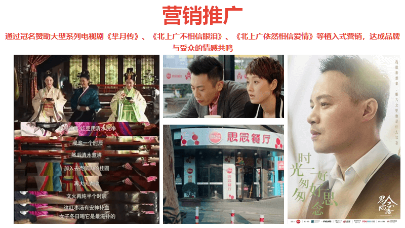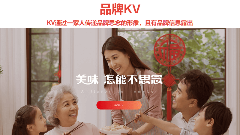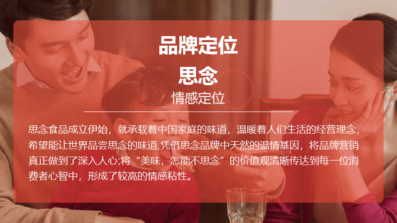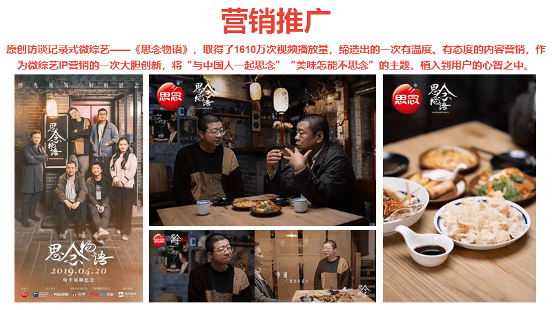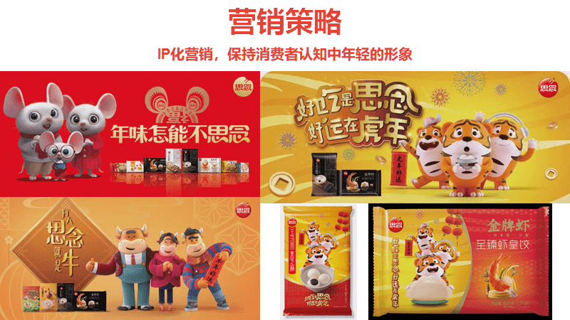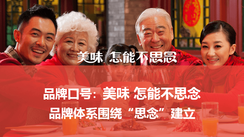 思念围绕情感感的品牌定位——思念,通过输出“美味,怎能不思念”这一口号,建立品牌的“思念”体系,视觉上以一家人传递品牌思念的形象。营销上IP化营销,让思念这个已成立20多年之久的“老”公司年轻了许多,又通过综艺赞助、热播电视剧赞助及微综艺的输出,将品牌“思念”的定位声入人心。