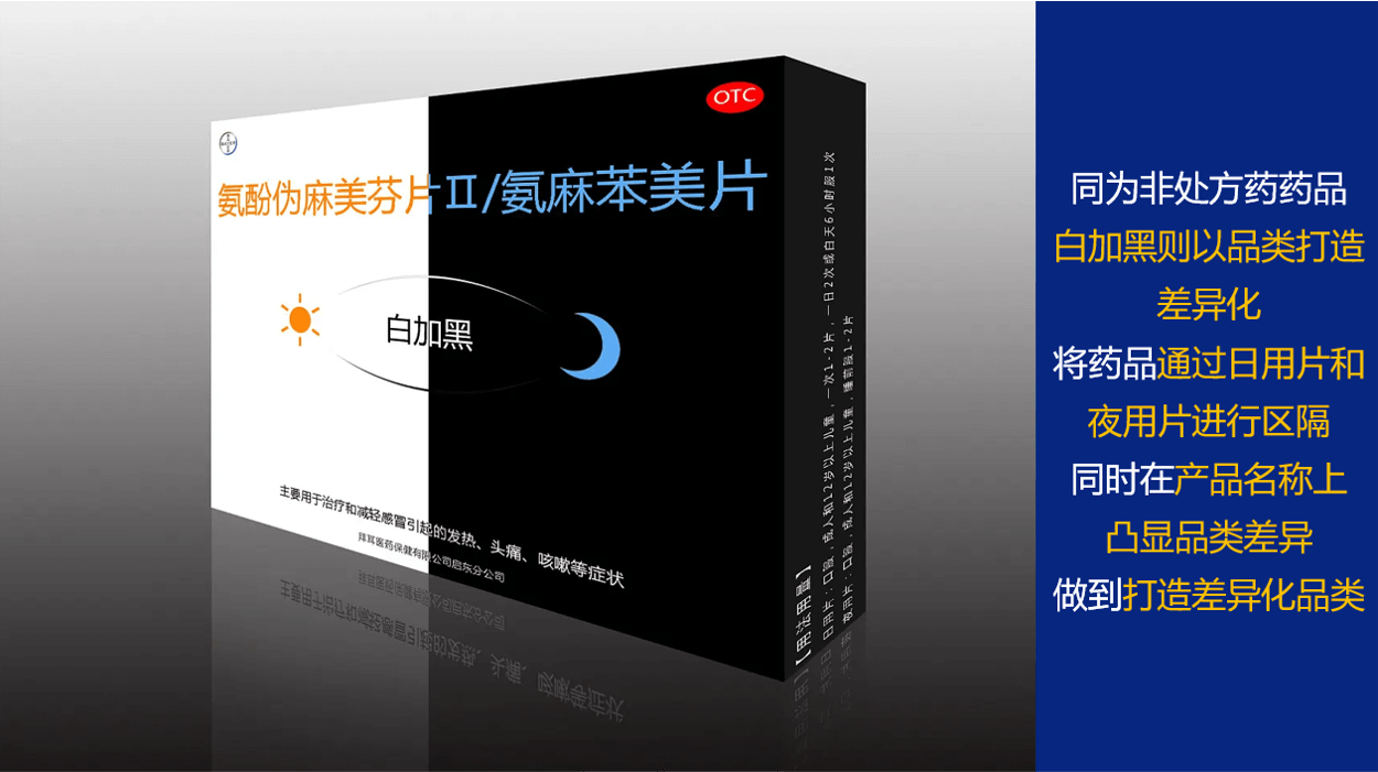 同为非处方药药品,白加黑则以品类打造差异化,将药品通过日用片和夜用片进行区隔,同时在产品名称上,凸显品类差异,做到打造差异化品类。