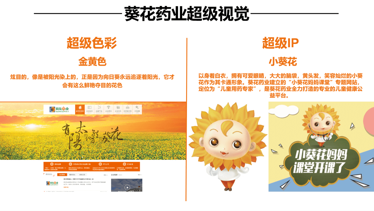 比如葵花药业的小葵花,以身着白衣,拥有可爱眼睛,大大的脑袋,黄头发,笑容灿烂的小葵花作为其卡通形象。葵花药业建立的“小葵花妈妈课堂”专题网站,定位为“儿童用药专家”,是葵花药业全力打造的专业的儿童健康公益平台。