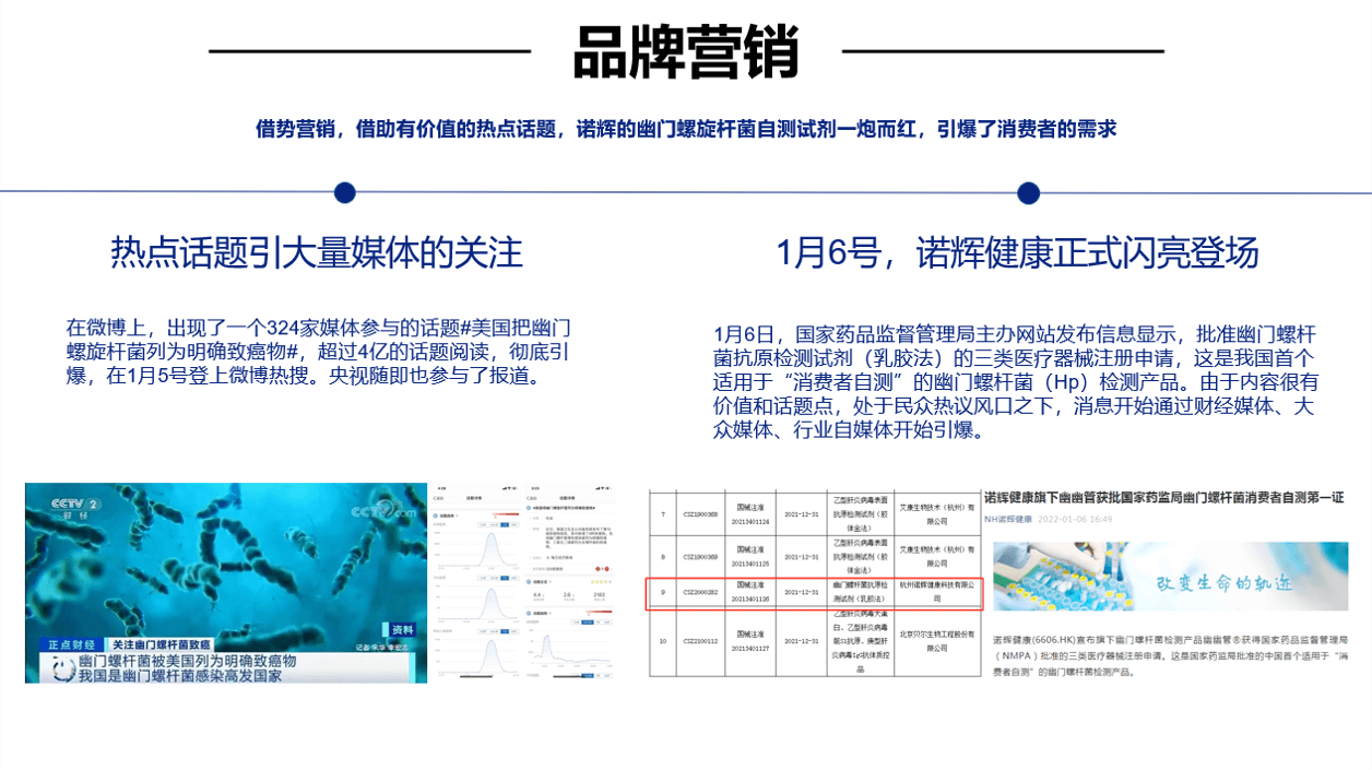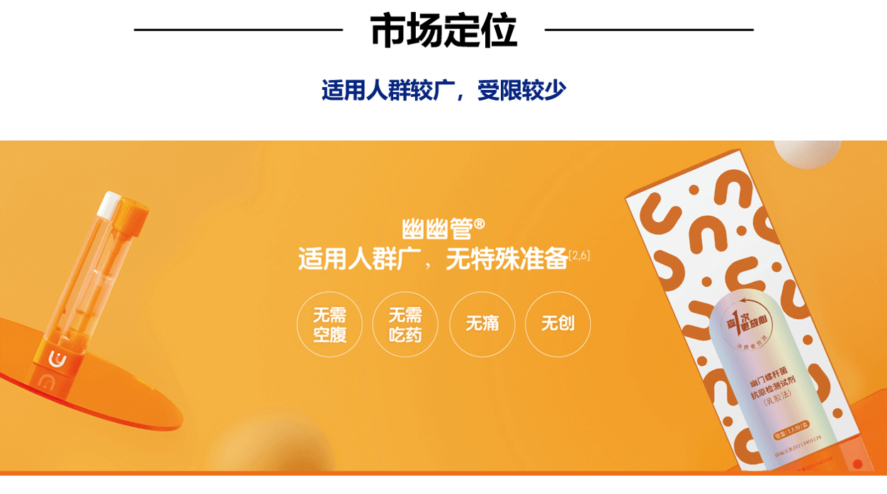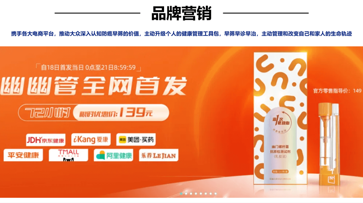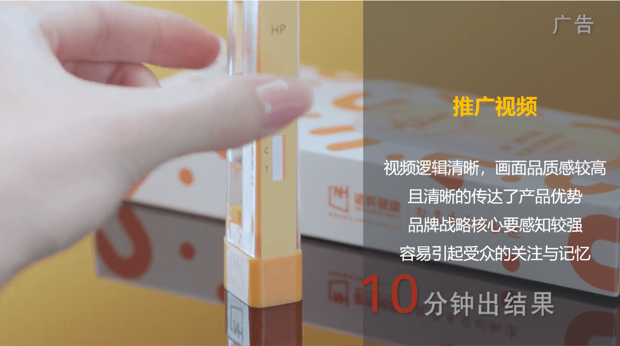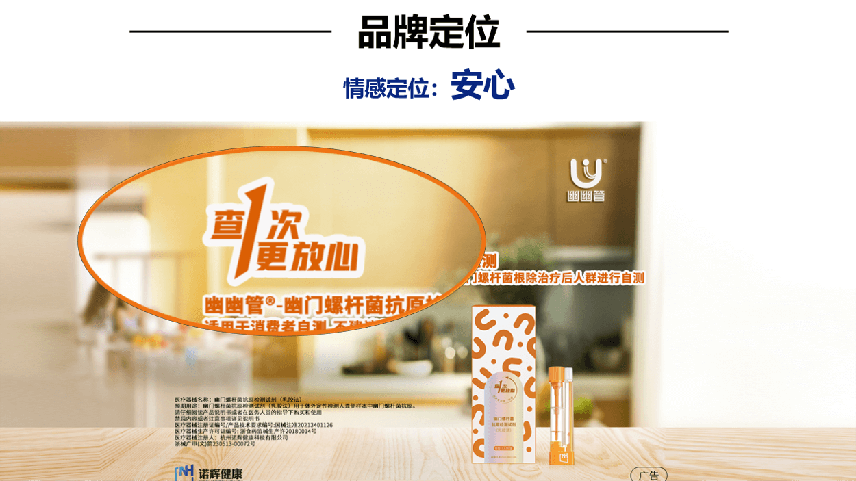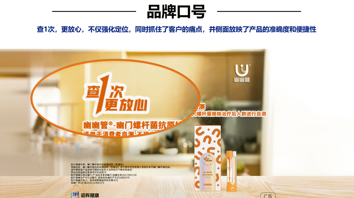 除以上案例以外,我们也举例了系统化打造品牌的案例,比如诺辉健康旗下的幽幽管。首先诺辉健康在企业品牌层面就有清晰的定位,即中国癌症早筛的引领者和居家检测的开创者,打出了“改变生命的轨迹”这样就有高度的理念型口号,同时整合用户故事,通过真实的声音,表达每一件与生命有关的事情,都值得被坚守的理念,不仅形成自身独有的品牌故事,也与品牌的价值主张相呼应。而产品的开发也围绕着自身的定位展开,本次我们重点分析其新品【幽幽管】,专注于幽门螺杆菌自测。
