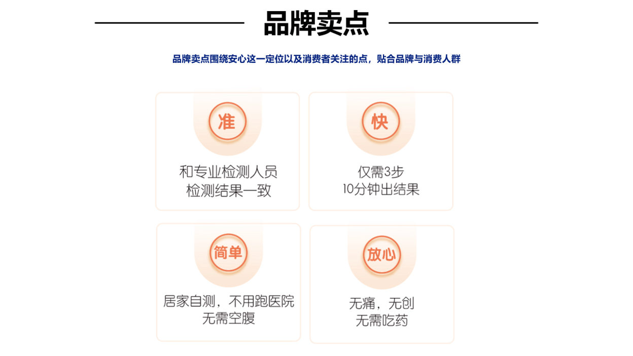 幽幽管其面向人群较广泛,定位也是抓的非常精准,主张“安心”的情感定位,“查一次,更放心“的口号,不仅强化了品牌定位,同时抓住了客户的痛点,并侧面放映了产品的准确度和便捷性。为了使广大受众能够直接感知到品牌的利益价值,打出了”准、快、简单、放心“的4大核心卖点。
