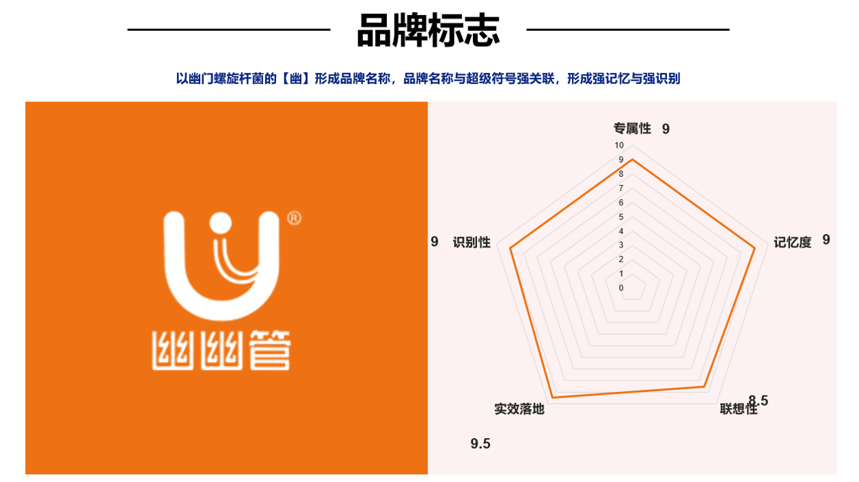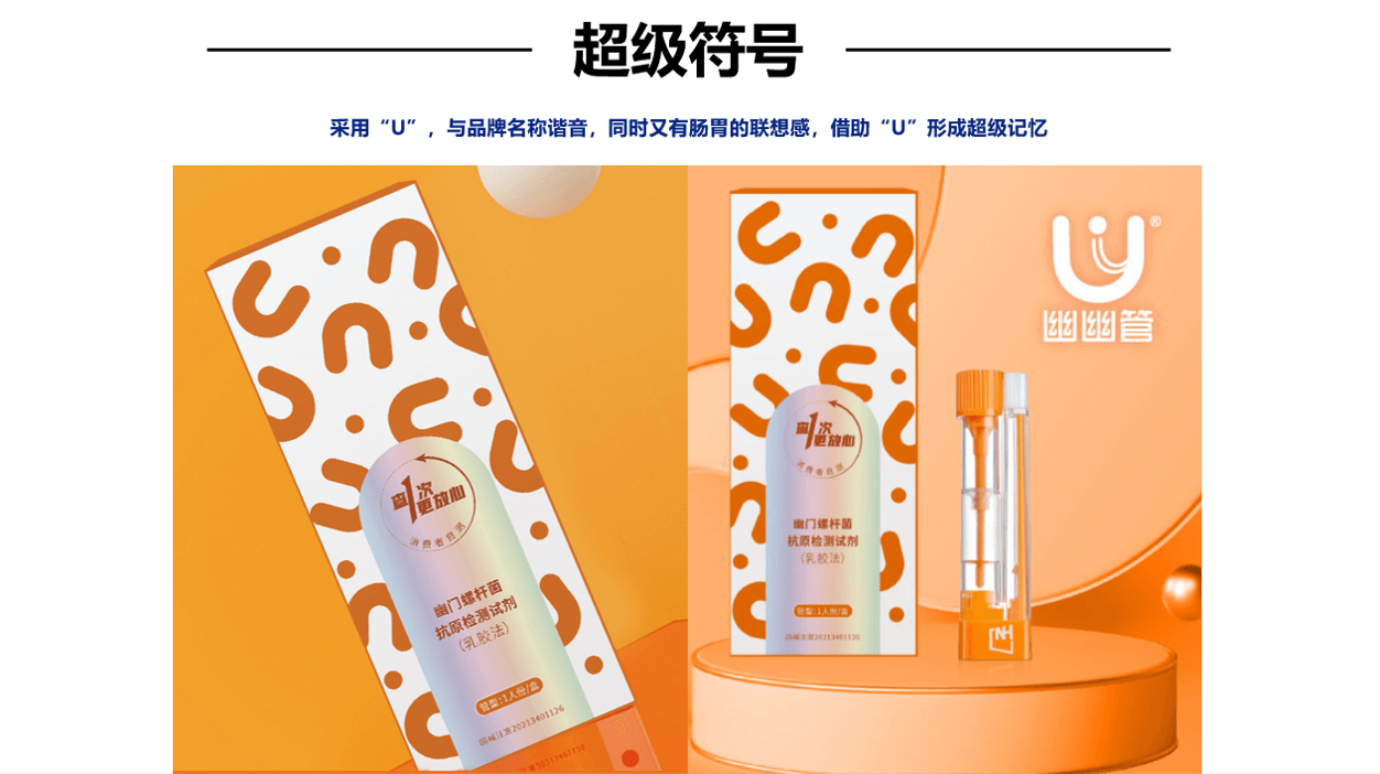 在视觉层面,幽幽管跳脱出了药品品牌以往传统、无趣的形象,抓取了“U”这个符号,不仅与品牌名称谐音,同时又有肠胃的联想感,通过放大使用“U”这个符号,形成超级记忆,图形标与超符一脉形成,沿袭了“U”的特殊记忆。