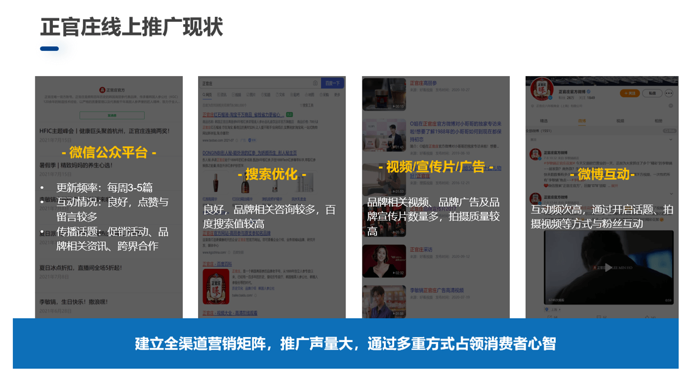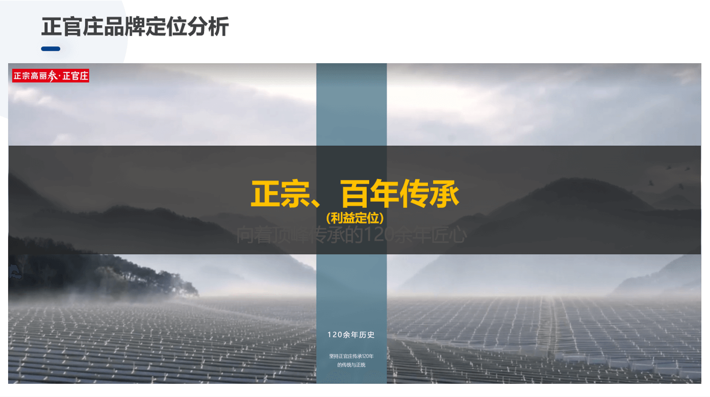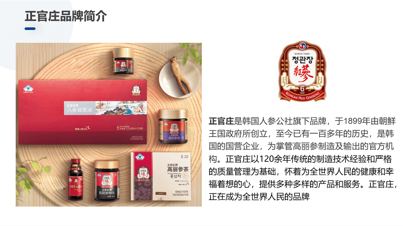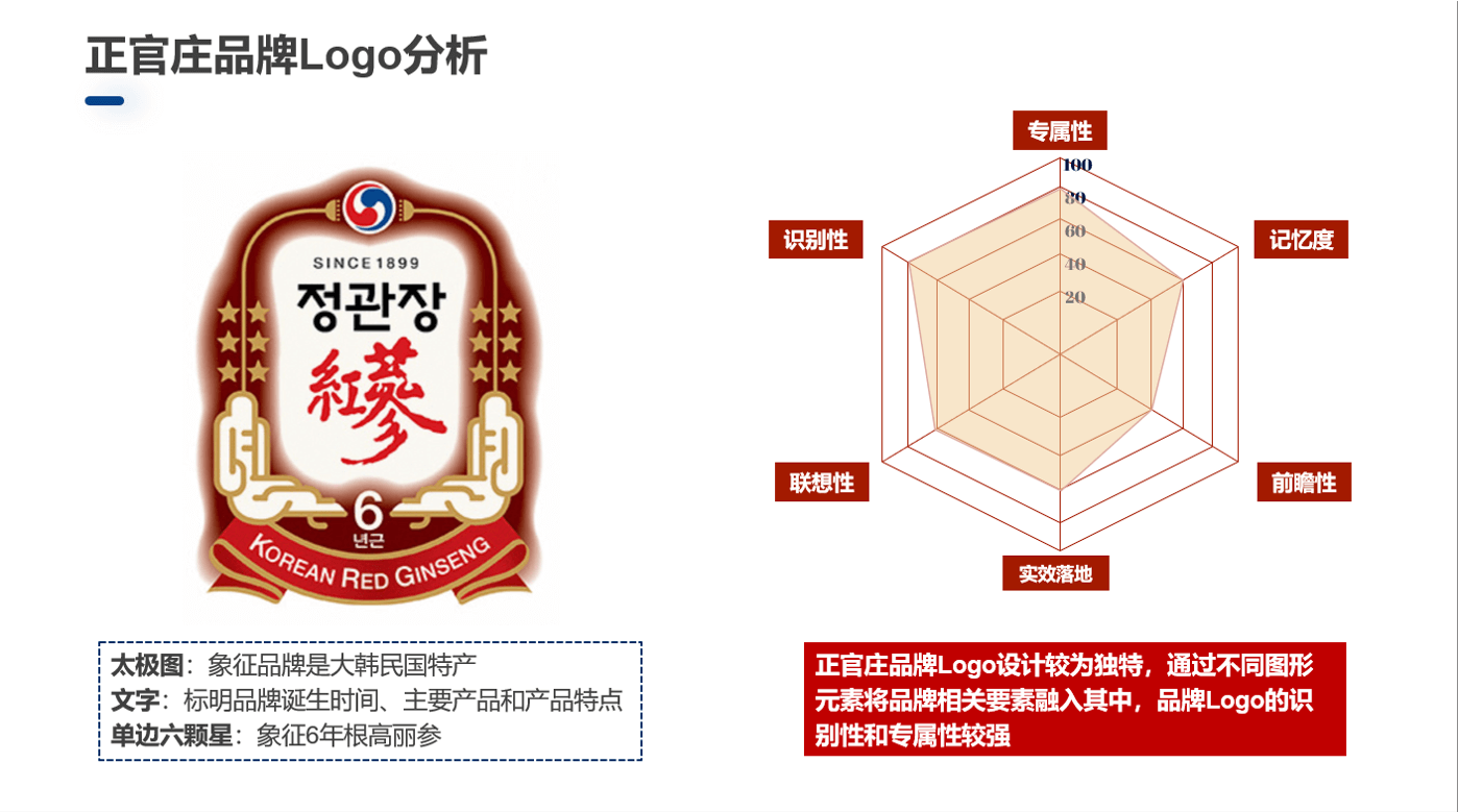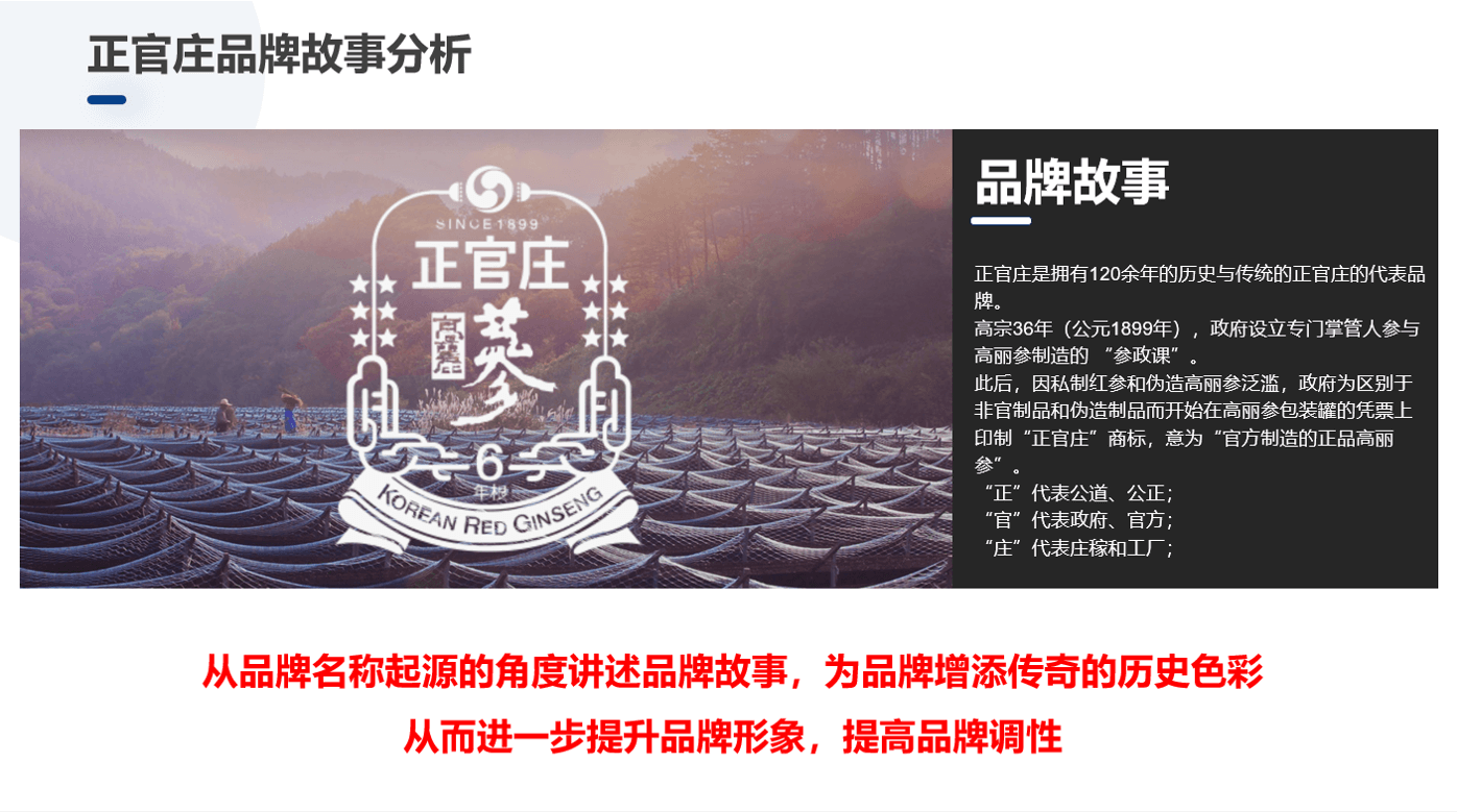 同时,我们也发现,在人参皂苷领域,目前还未有强势品牌出现,这对进行来说是一大机会点。为了使今幸的高层理解品牌差异化该如何体现,我们将范围扩大一步,以红参保健品品牌正官庄为例,进行品牌系统化升级价值诠释。