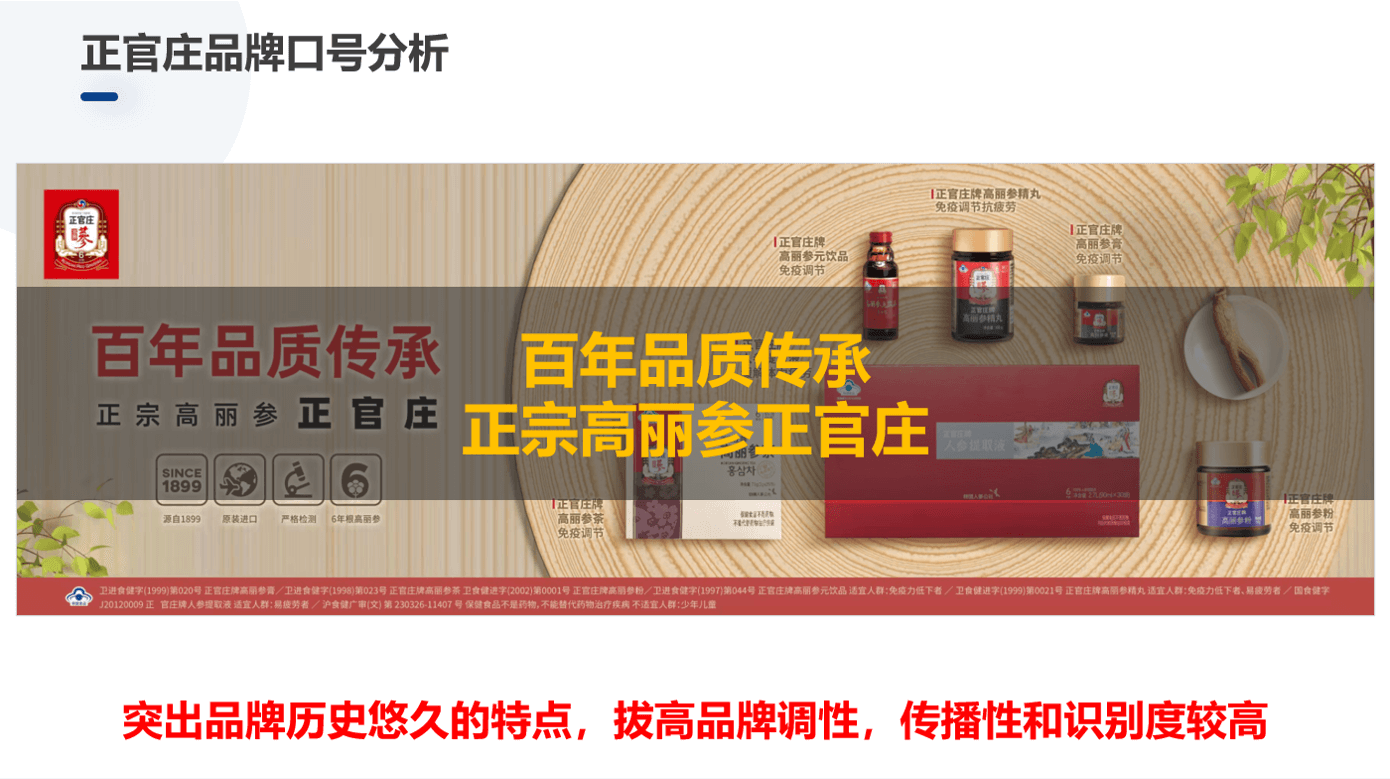 首先,正官庄的品牌定位非常清晰,主张“正宗、百年传承”,打出“百年品质传承,正宗高丽参正官庄”的口号,突出品牌历史悠久的特点,拔高品牌调性,传播性和识别度较高;同时讲出了品牌故事,为品牌增添传奇的历史色彩,从而进一步提升品牌形象,提高品牌调性。在卖点层面,主要凸显2大核心优势,卖点1即原料采用6年根高丽参,营养成分最充足,口感好,卖点2即百年品质传承,匠心制参121年。