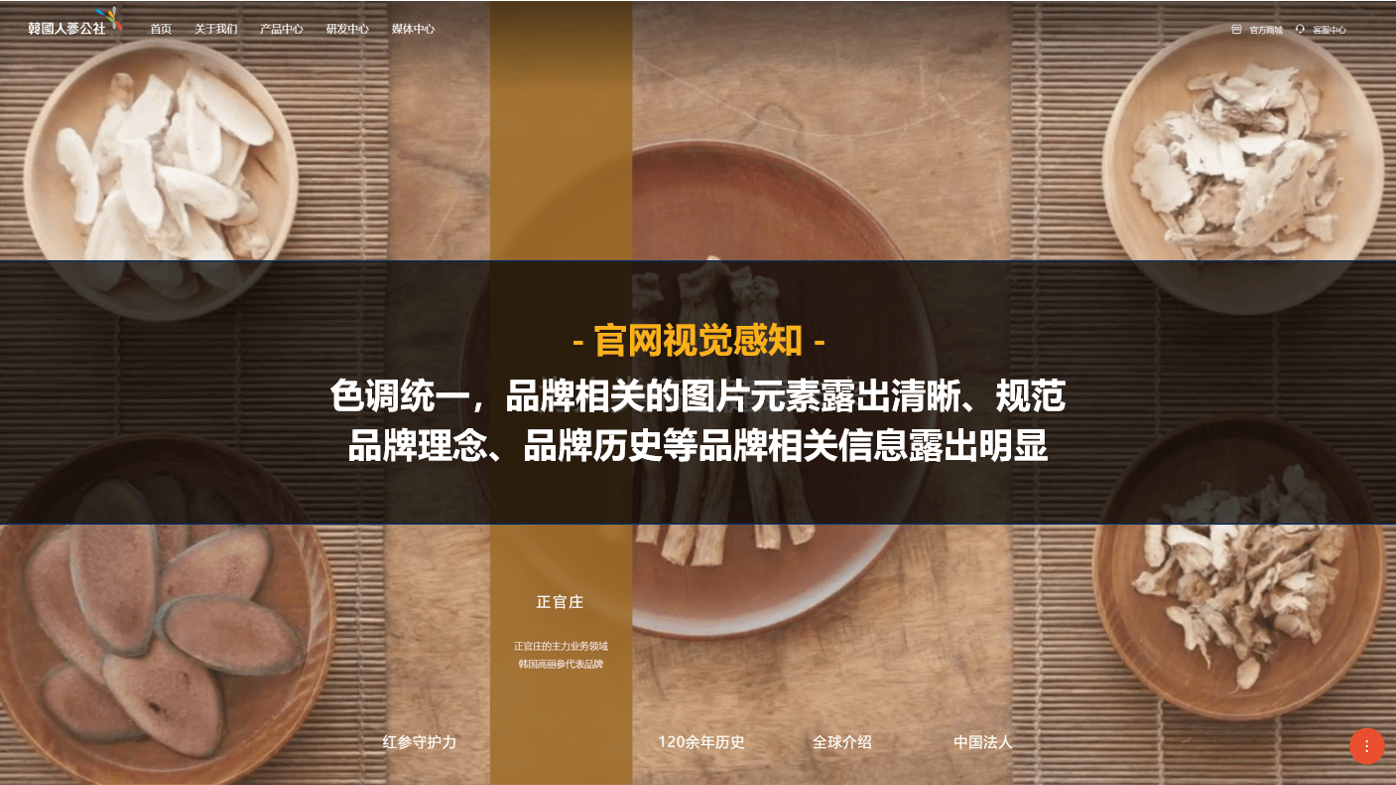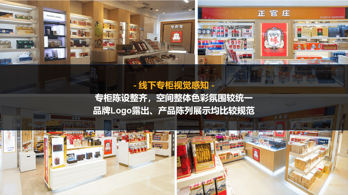 在视觉层面,正官庄品牌Logo设计较为独特,通过不同图形元素将品牌相关要素融入其中,品牌Logo的识别性和专属性较强;品牌官网的调性上,色调统一,品牌相关的图片元素露出清晰、规范,品牌理念、品牌历史等品牌相关信息露出明显;一些宣创KV上,品牌Logo、品牌卖点和产品元素露出明显,整体色彩和风格呈古风古韵特点,营造百年传承的氛围。线上的视觉感知中,专柜陈设整齐,空间整体色彩氛围较统一,品牌Logo露出、产品陈列展示均比较规范。