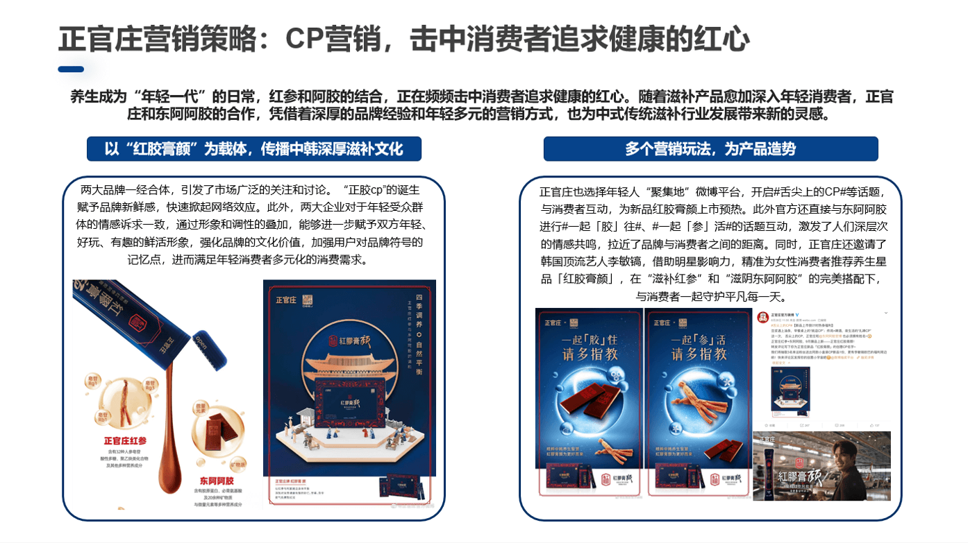 在营销层面,正官庄围绕年轻养生一代的特征,玩CP营销,击中消费者追求健康的红心。以“红胶膏颜”为载体,传播中韩深厚滋补文化。