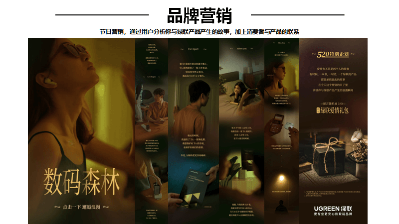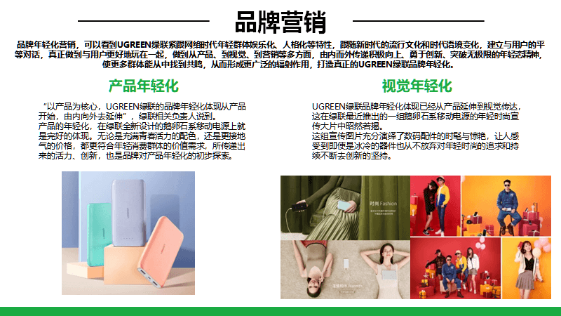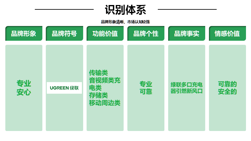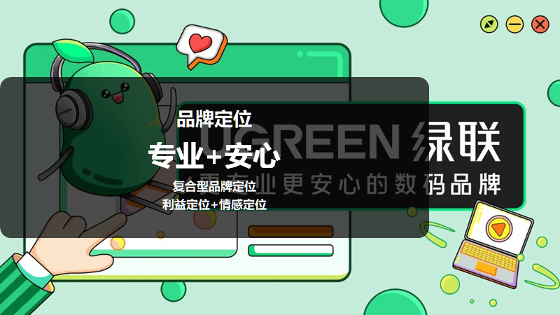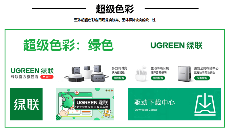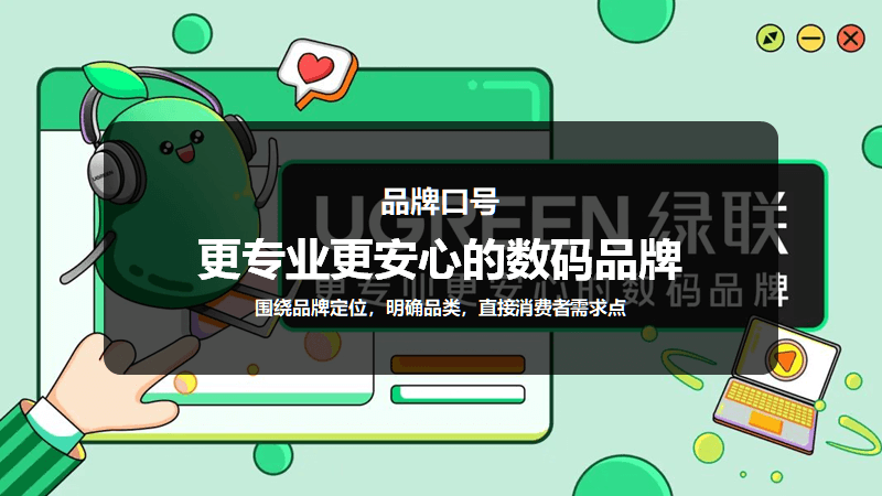 绿联围绕品牌核心定位【专业+安心】,系统系建设品牌,品牌口号“更专心更专业的数码品牌”围绕品牌定位,明确品牌,凸显消费者需求点。理念体系完整,品牌识别体系清晰,形成较强的市场认知。超级色彩【绿色】,应用规范度较高,形成品牌高度统一性。并围绕年轻化及节日开展一些列营销活动,媒体矩阵健全,运营效果极佳。