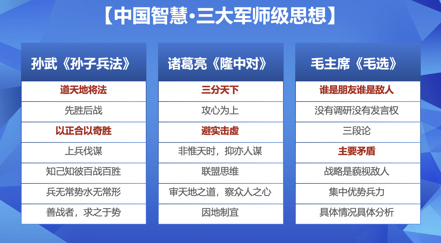 源于中国三大军师级思想:孙武(《孙子兵法》)、诸葛亮(《隆中对》)、毛教员(《毛选》);从《孙子兵法》中汲取 "道天地将法" 等战略思维与竞争策略,从《隆中对》中借鉴长远规划与布局理念,从《毛选》中领悟抓主要矛盾、战略三段论等方法。
