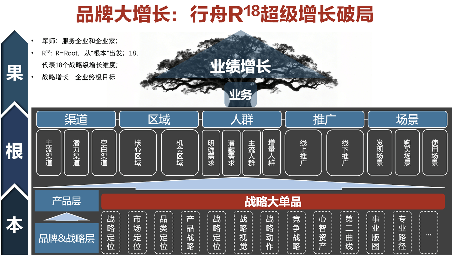 20年浸淫在品牌咨询行业,行舟已经逐步确立了企业或业务发展的4大终极方法:大定位、大竞争、大增长、第一战略。