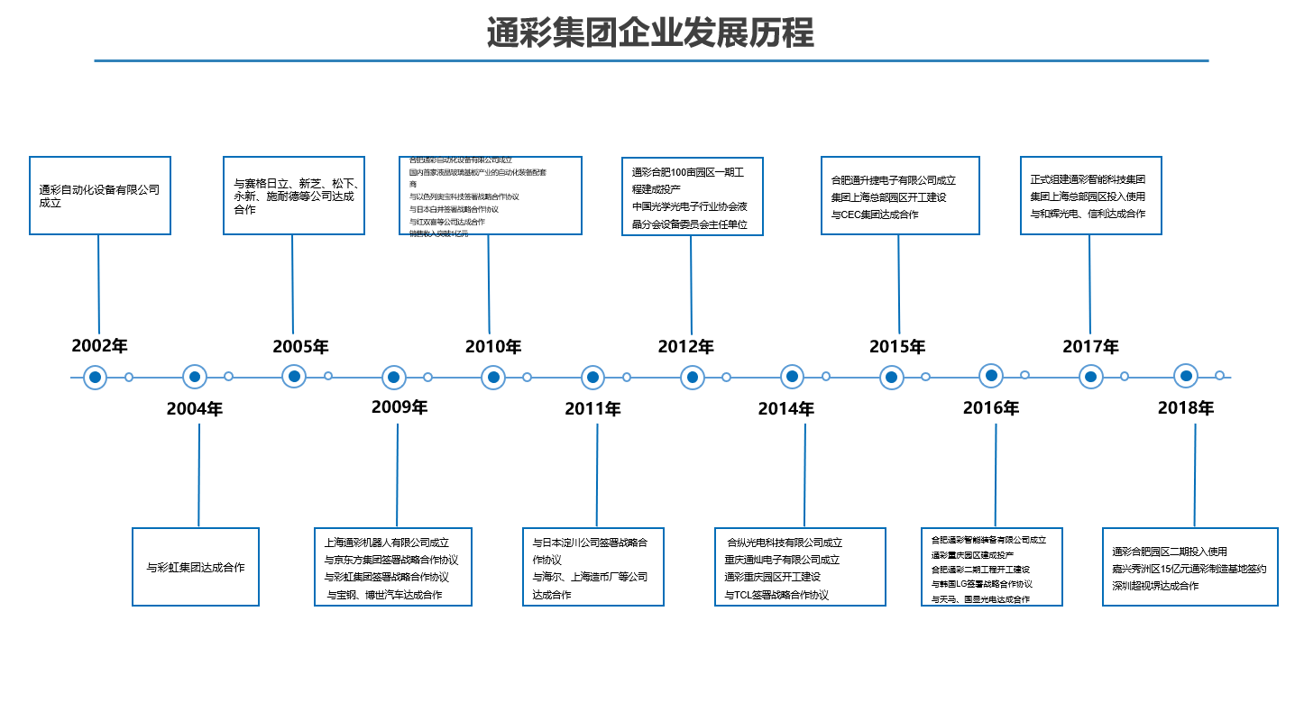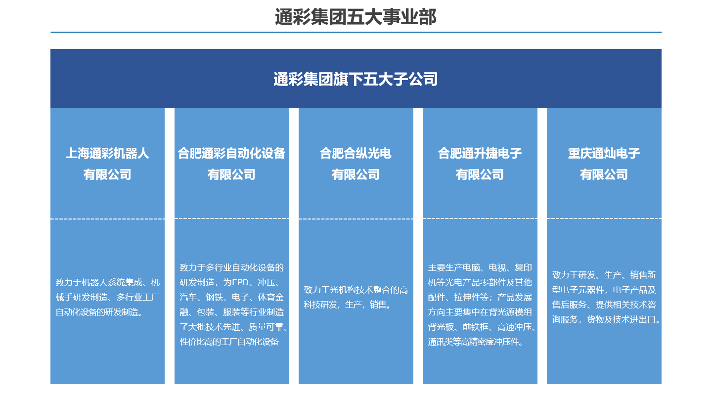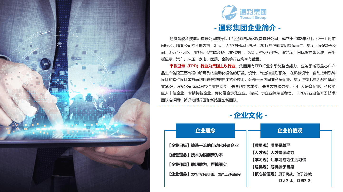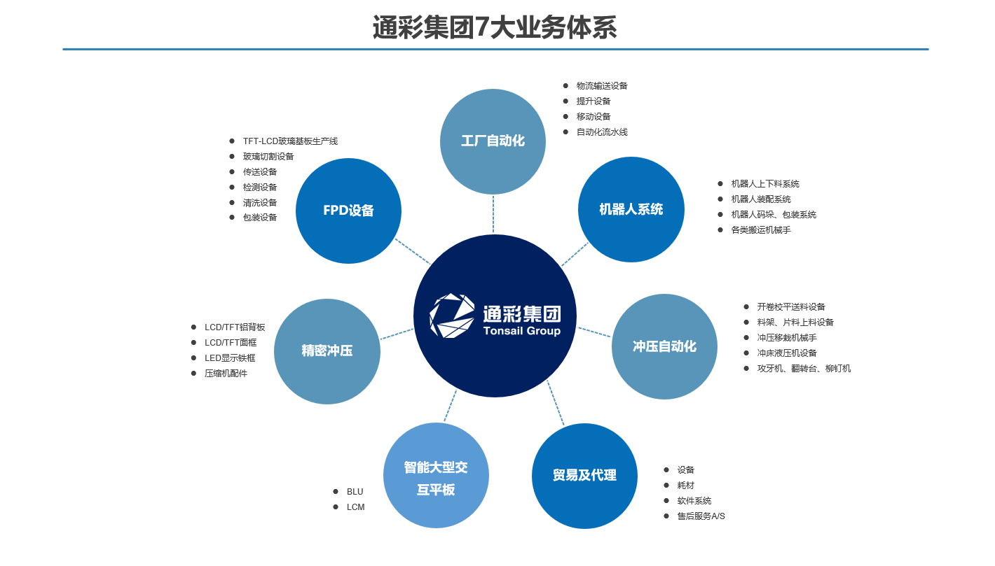 通彩集团通彩智能科技集团有限公司前身是上海通彩自动化设备有限公司,成立于2002年5月,位于上海市闵行区。随着公司的不断发展、壮大,为加快国际化进程,2017年通彩集团应运而生,集团下设5家子公司,3大产业园区,业务涵盖智能装备、精密冲压、智能大型交互平板、背光源、国际贸易等领域,在平板显示、汽车、冲压、家电、医药、金融等行业均享有盛誉。